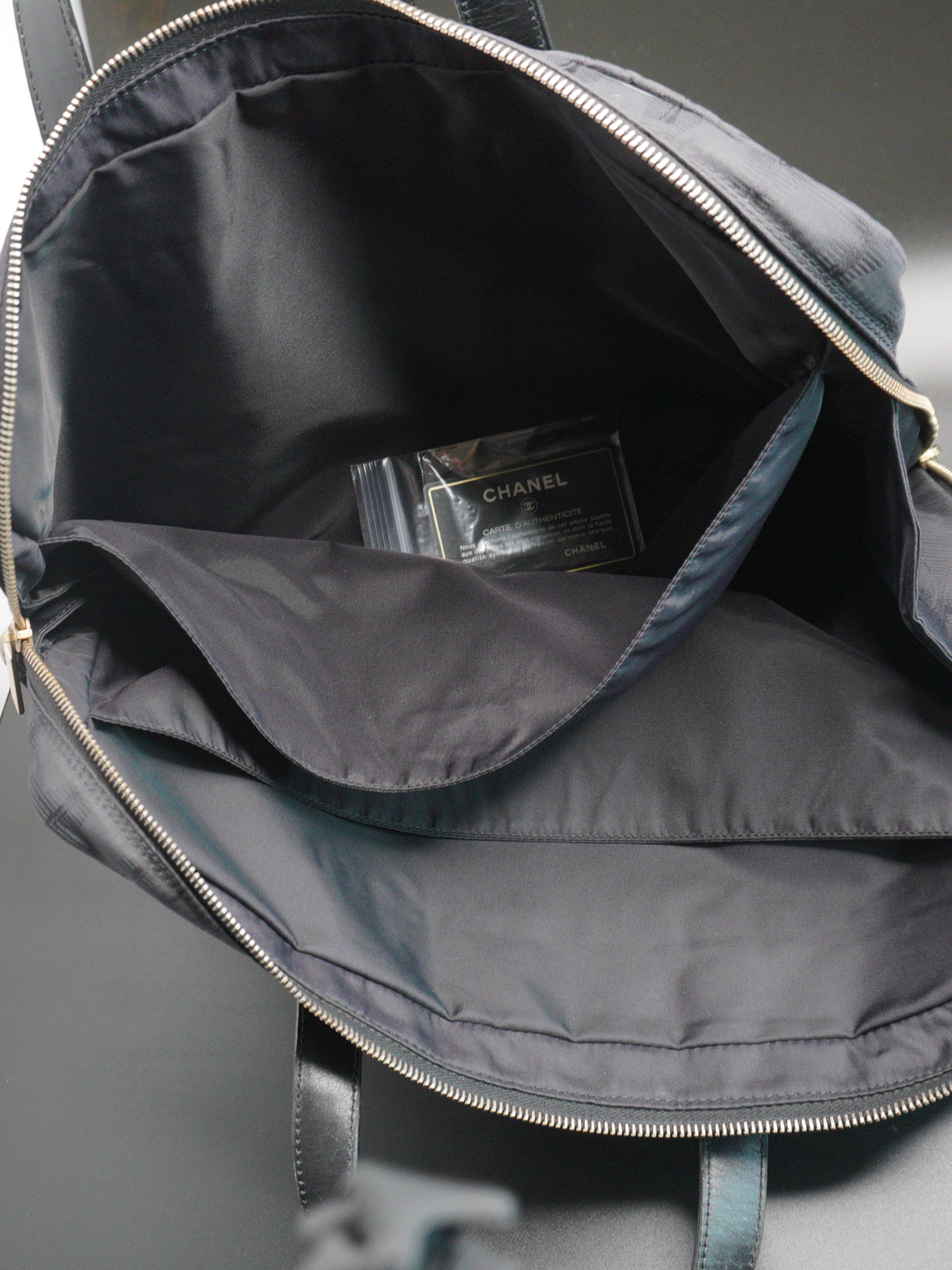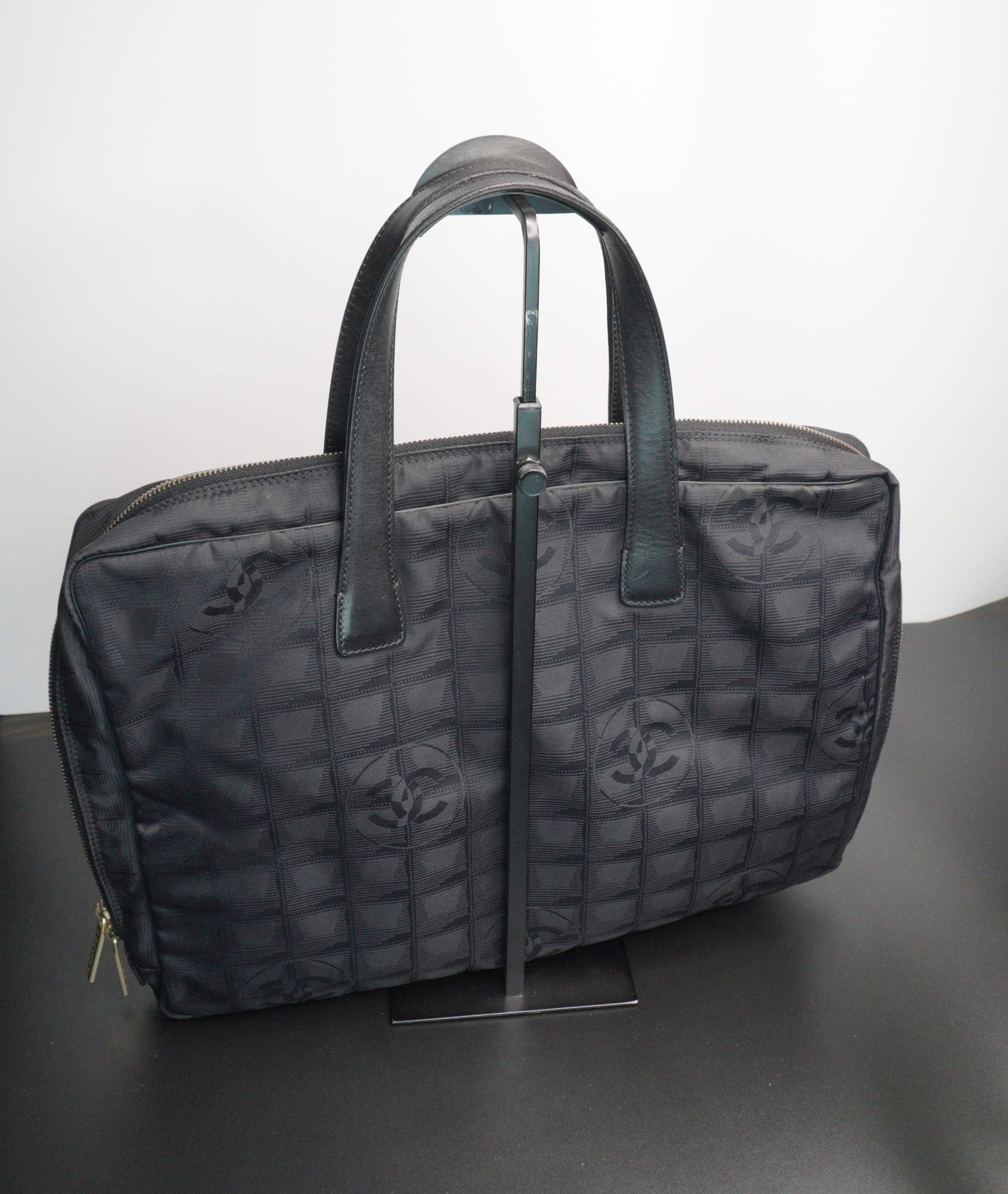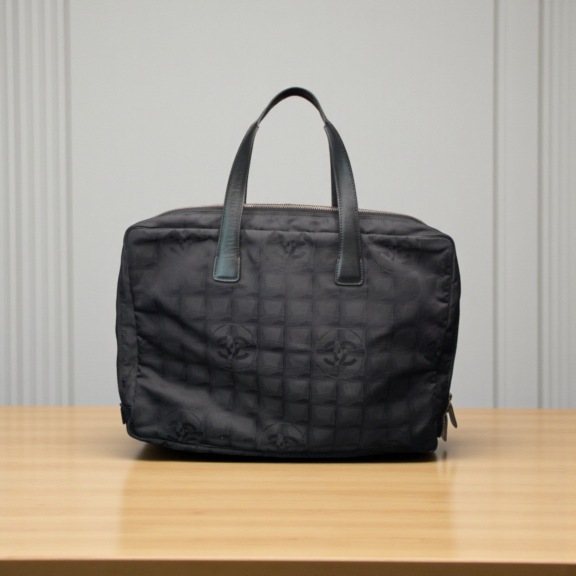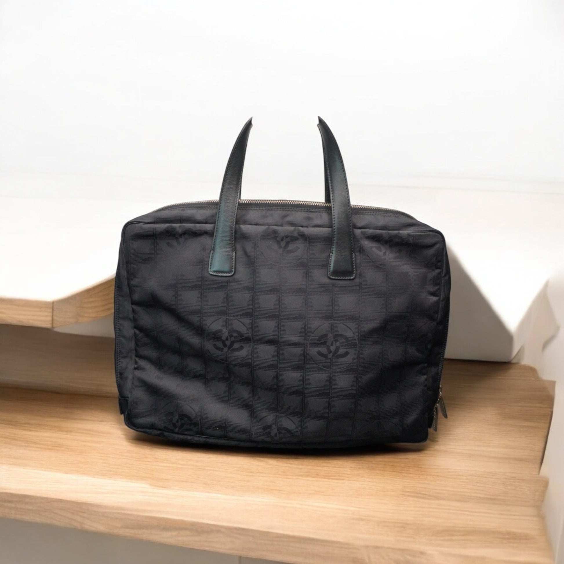 This Chanel Travel Line Handbag is a lightweight and functional piece crafted in black nylon with the iconic CC logo pattern throughout. Designed for everyday convenience or light travel, it features a structured silhouette with dual leather top handles and a secure zip-around closure. A sleek and understated design that’s both practical and chic.