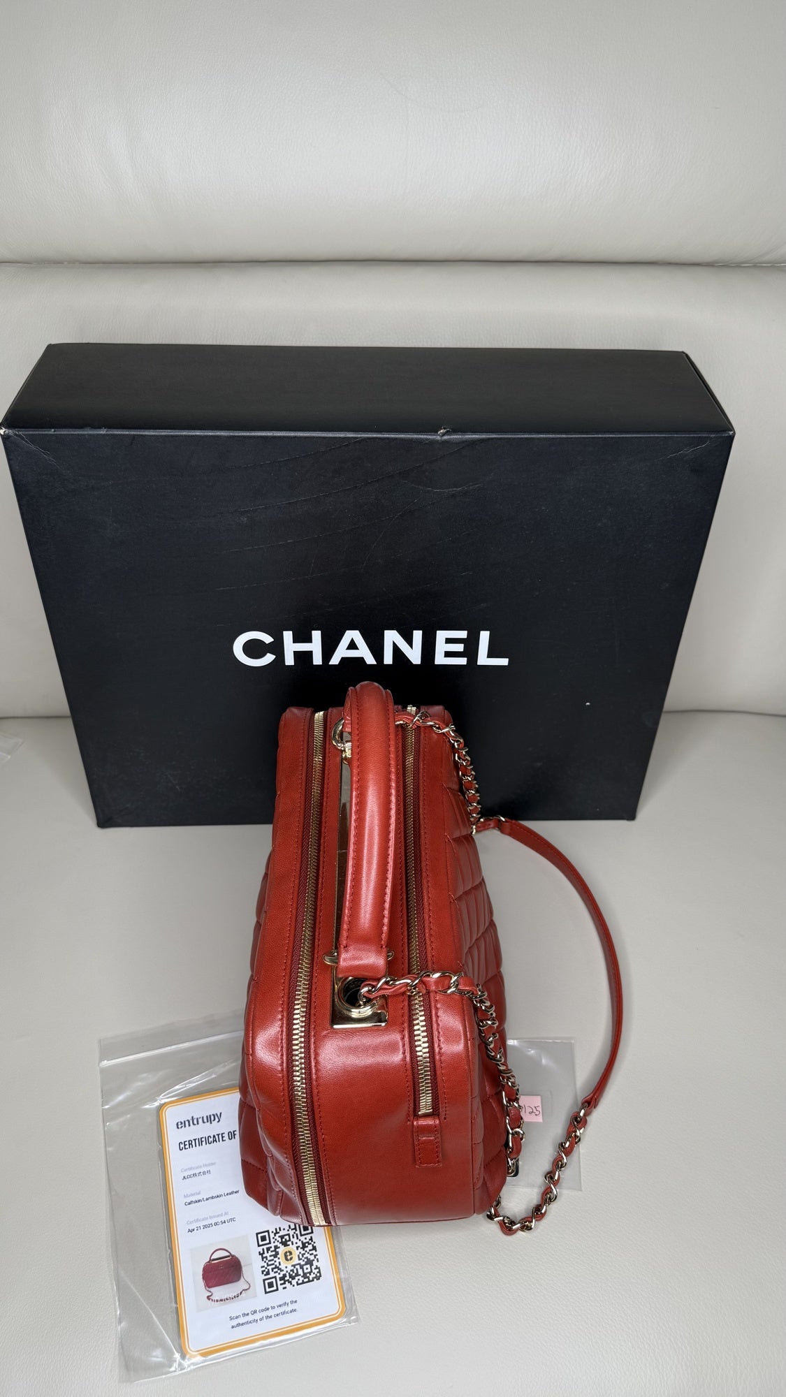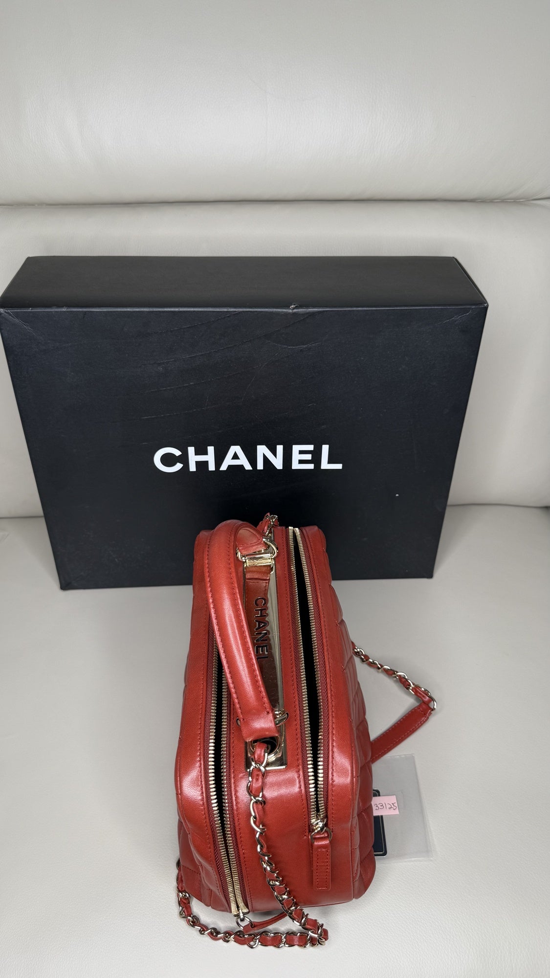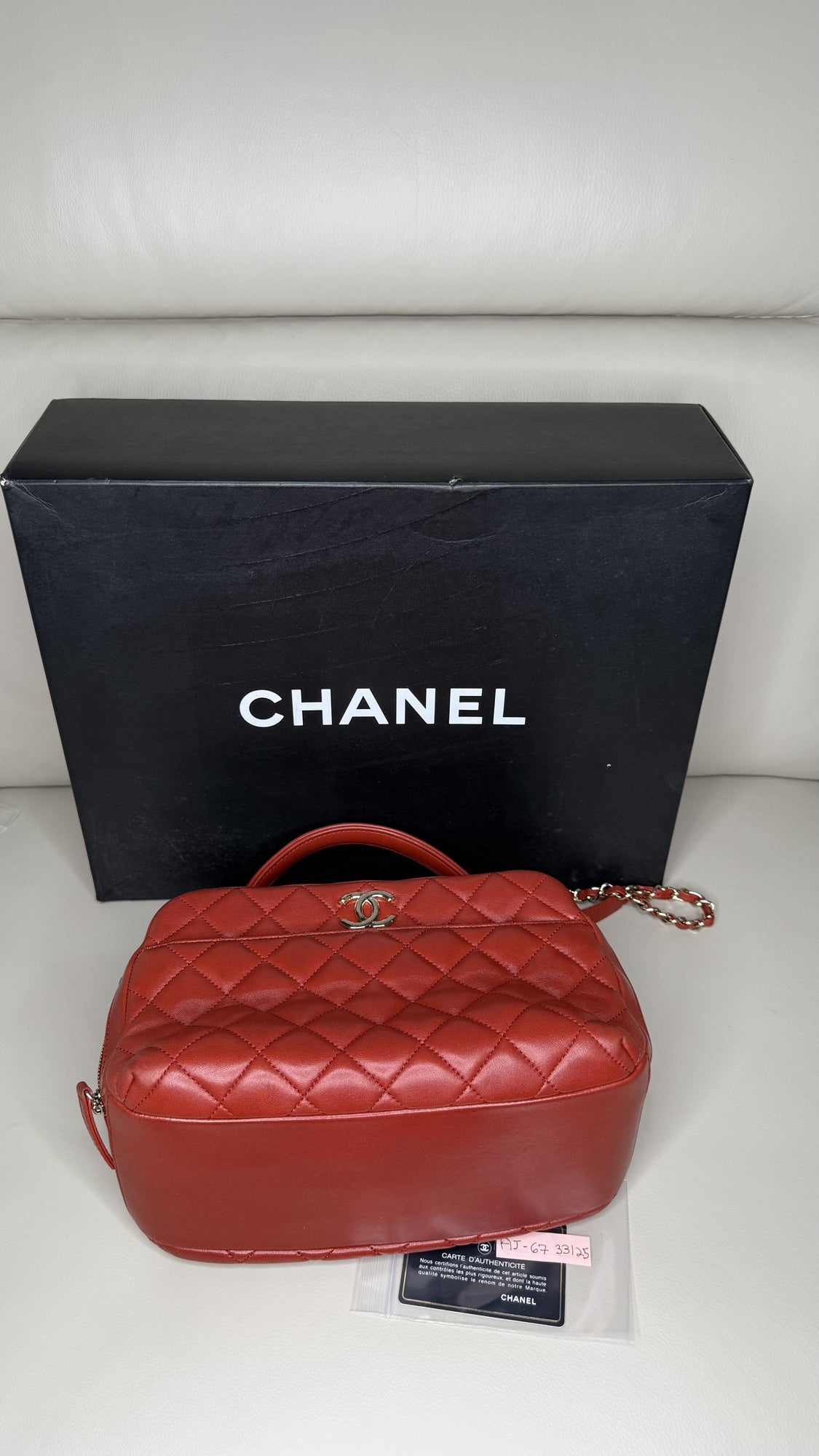 Make a bold statement with this Chanel Medium Trendy CC Bowling Bag, crafted from luxurious red quilted lambskin and accented with gleaming gold-tone hardware. The structured silhouette and signature “CHANEL” metal plaque across the top add a polished edge, while dual zip compartments and a central flap pocket offer practical storage with iconic flair. A top handle and removable shoulder strap provide versatile carry options—perfect for elevating everyday wear or completing a chic travel look.