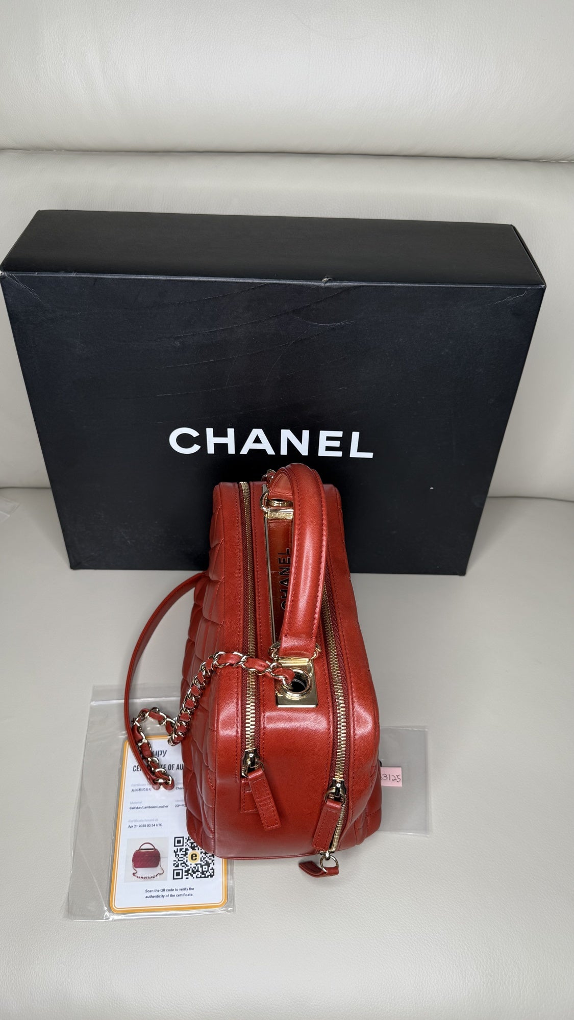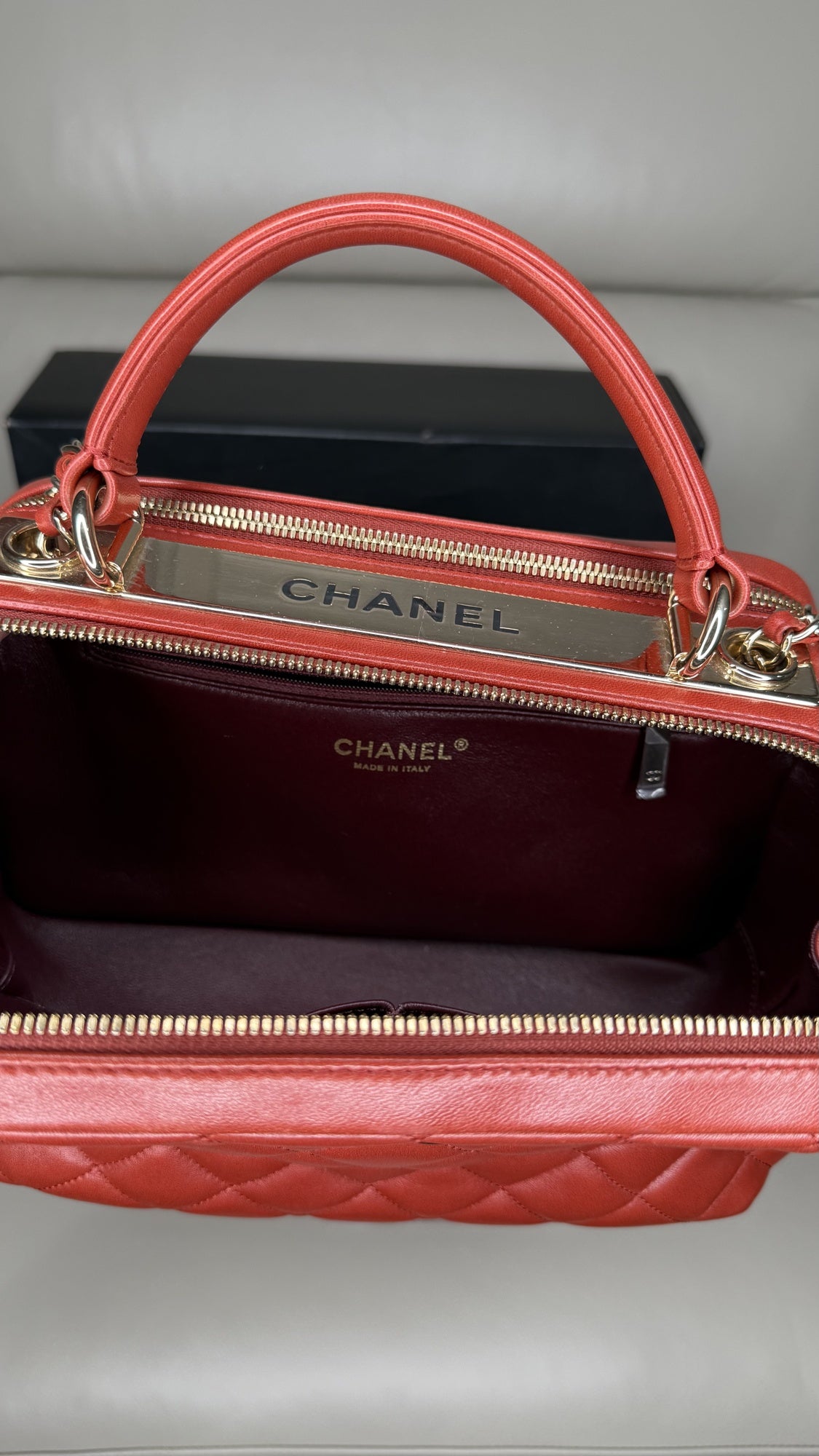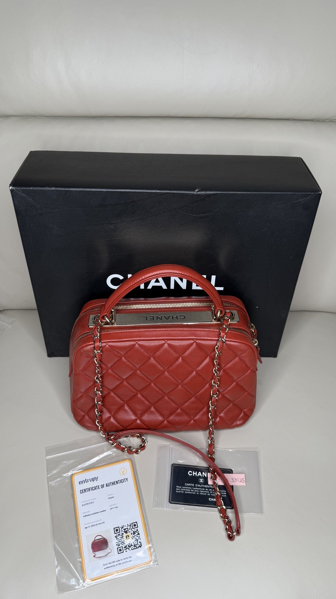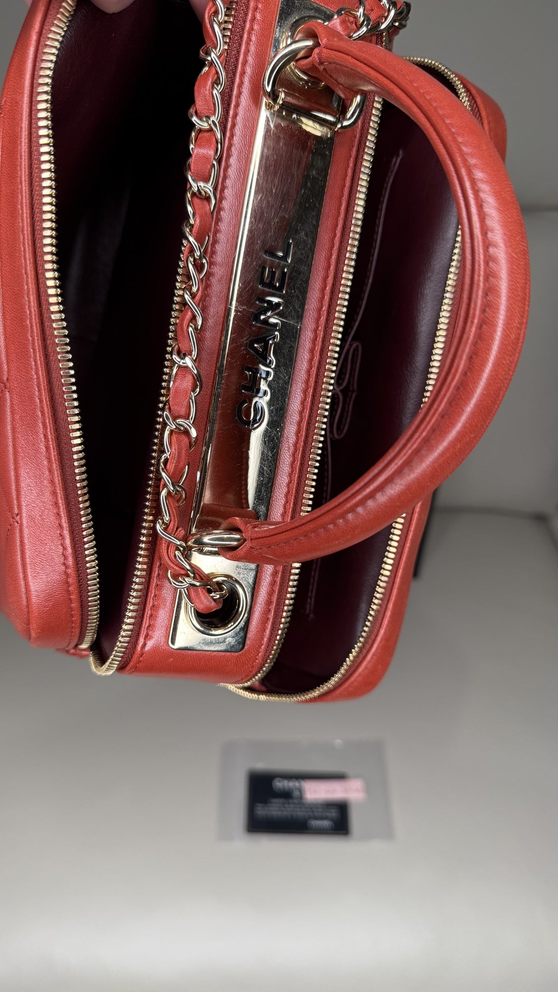 Make a bold statement with this Chanel Medium Trendy CC Bowling Bag, crafted from luxurious red quilted lambskin and accented with gleaming gold-tone hardware. The structured silhouette and signature “CHANEL” metal plaque across the top add a polished edge, while dual zip compartments and a central flap pocket offer practical storage with iconic flair. A top handle and removable shoulder strap provide versatile carry options—perfect for elevating everyday wear or completing a chic travel look.