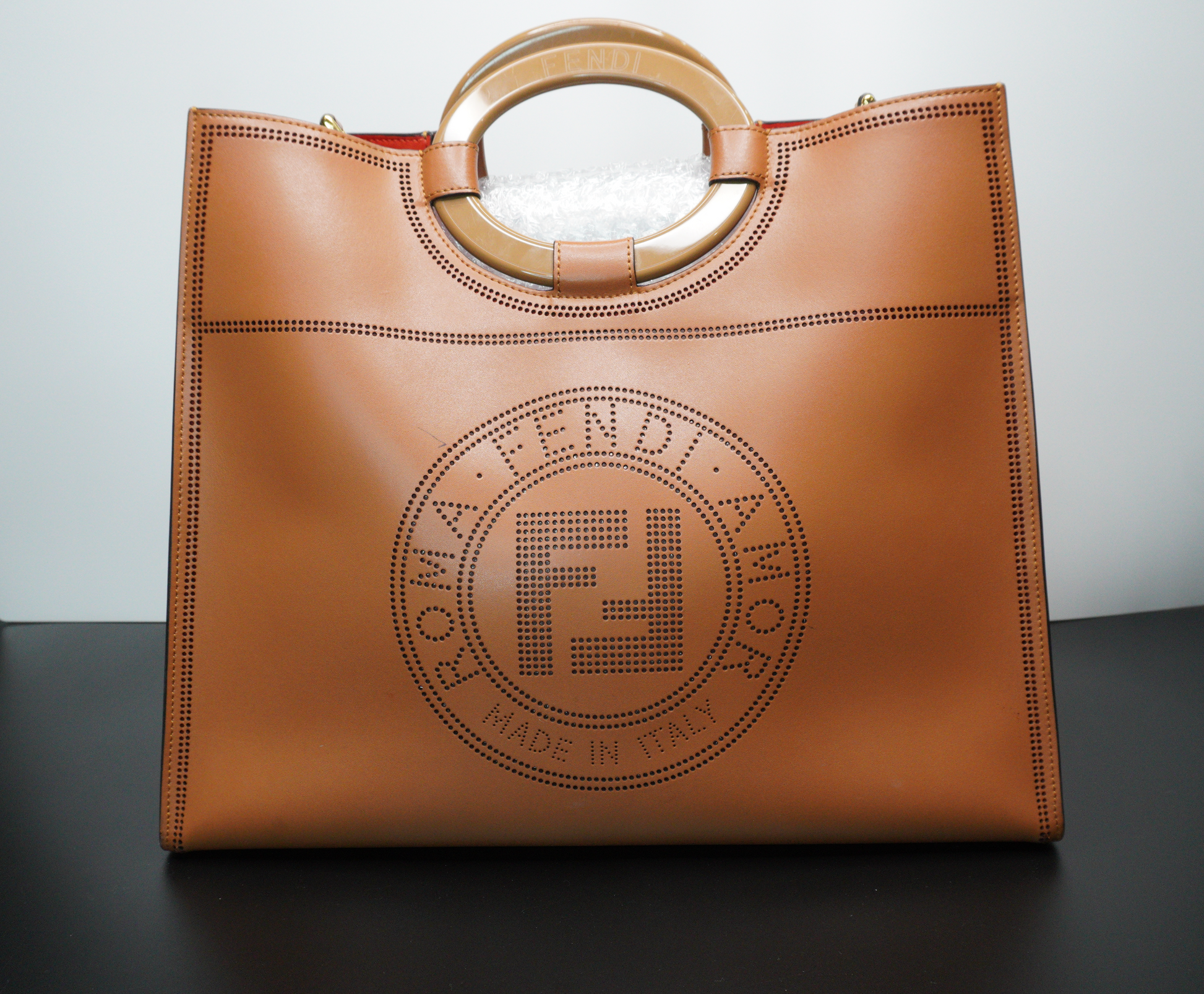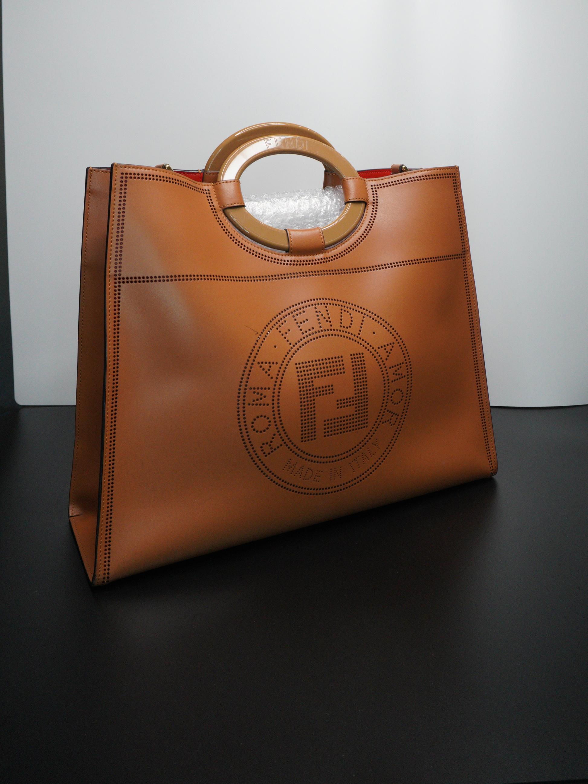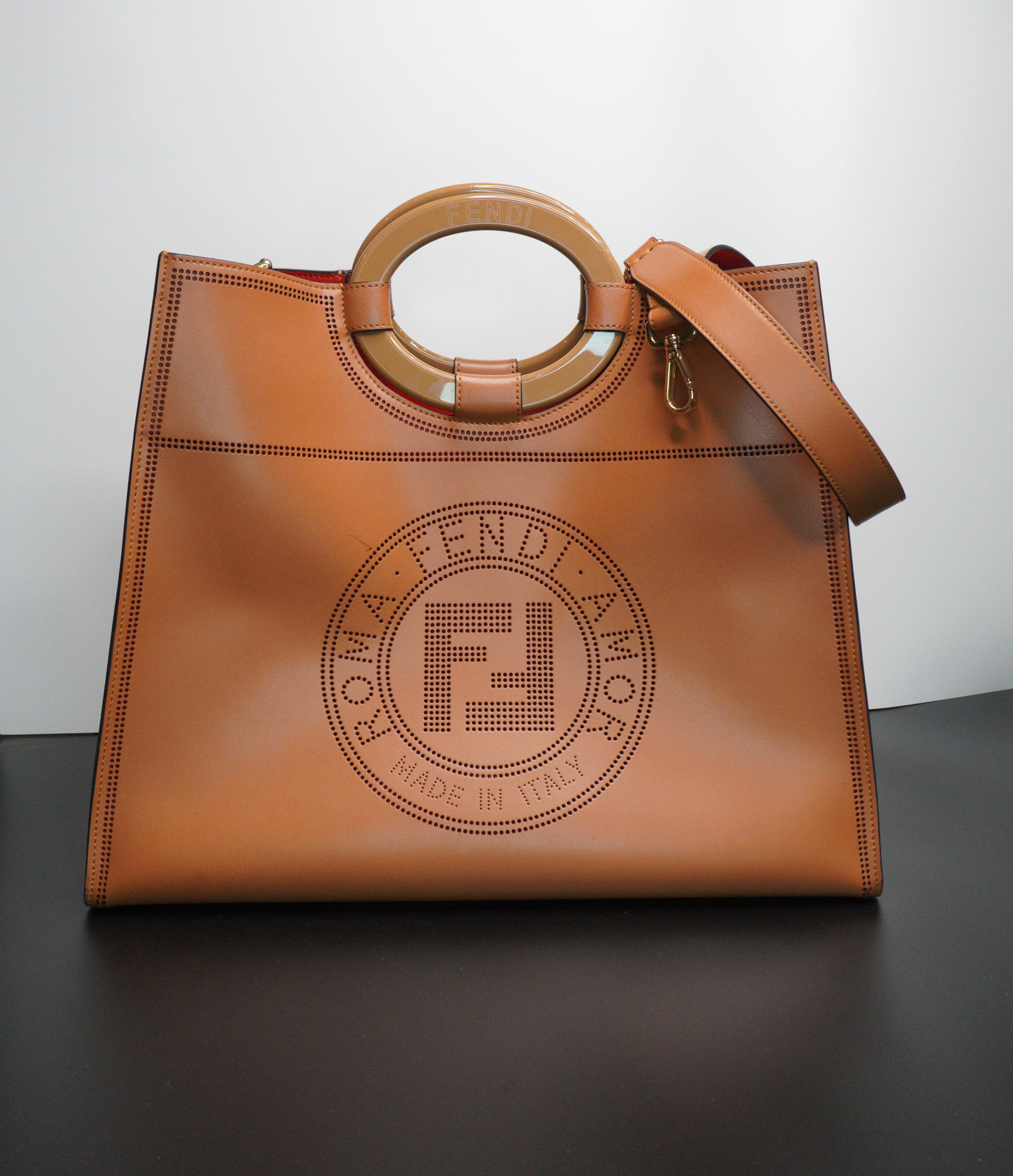 A bold and elegant everyday carry, the Fendi Runway Shopper Tote blends minimalism with signature branding. Featuring smooth tan leather, circular top handles in glossy tortoiseshell-style resin, and the iconic perforated Fendi Roma logo, this structured tote is designed for effortless luxury and maximum space.