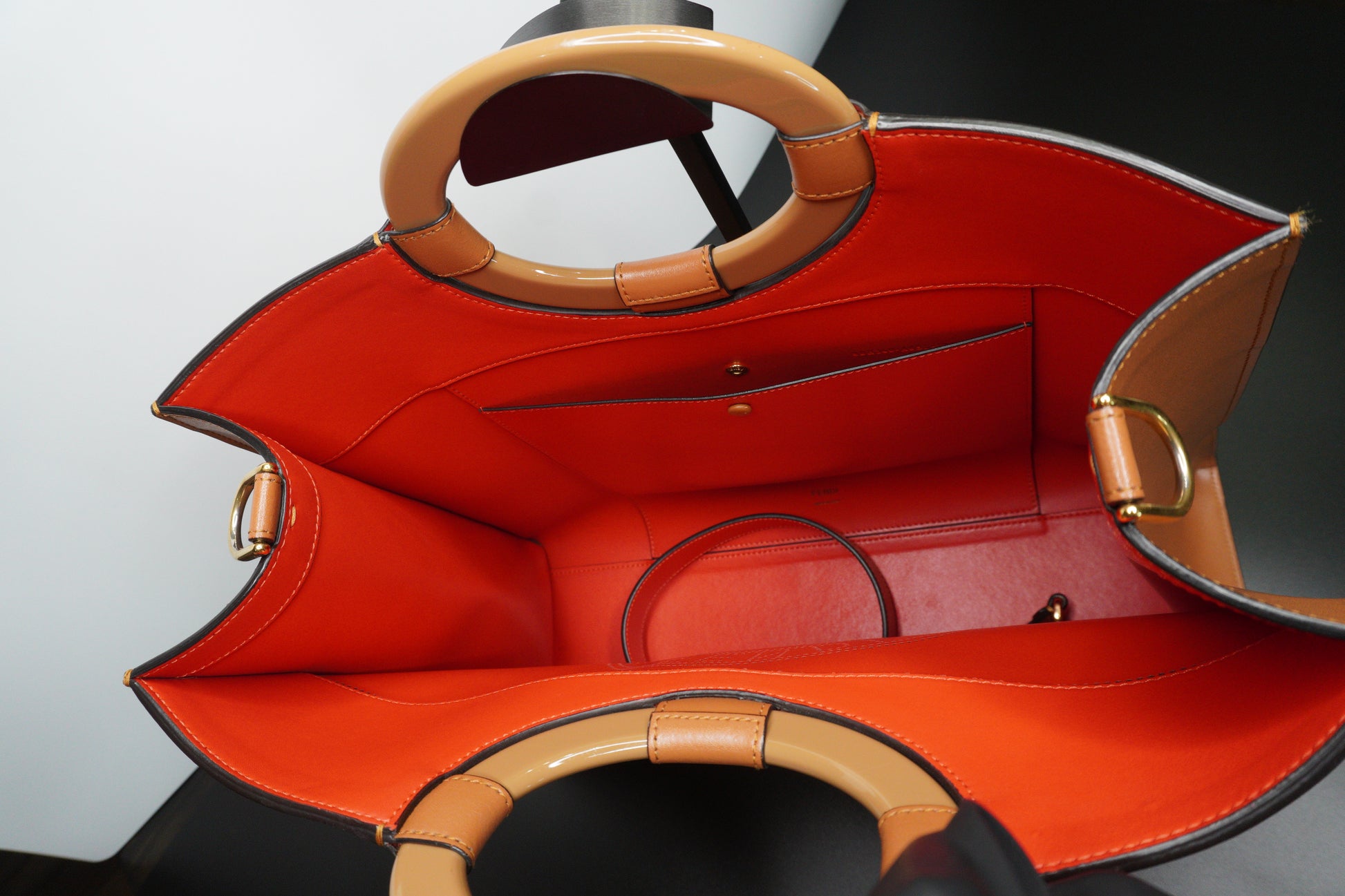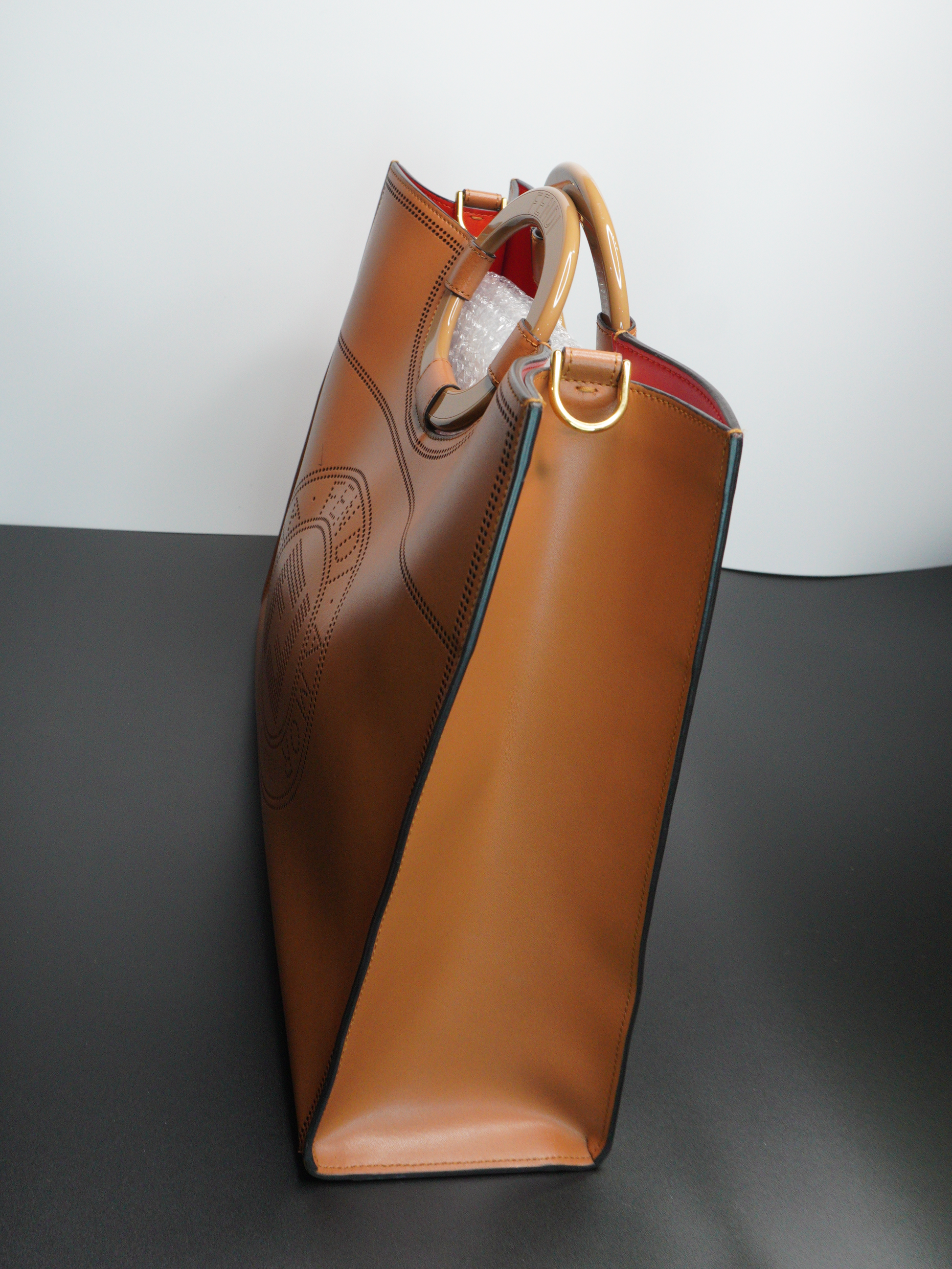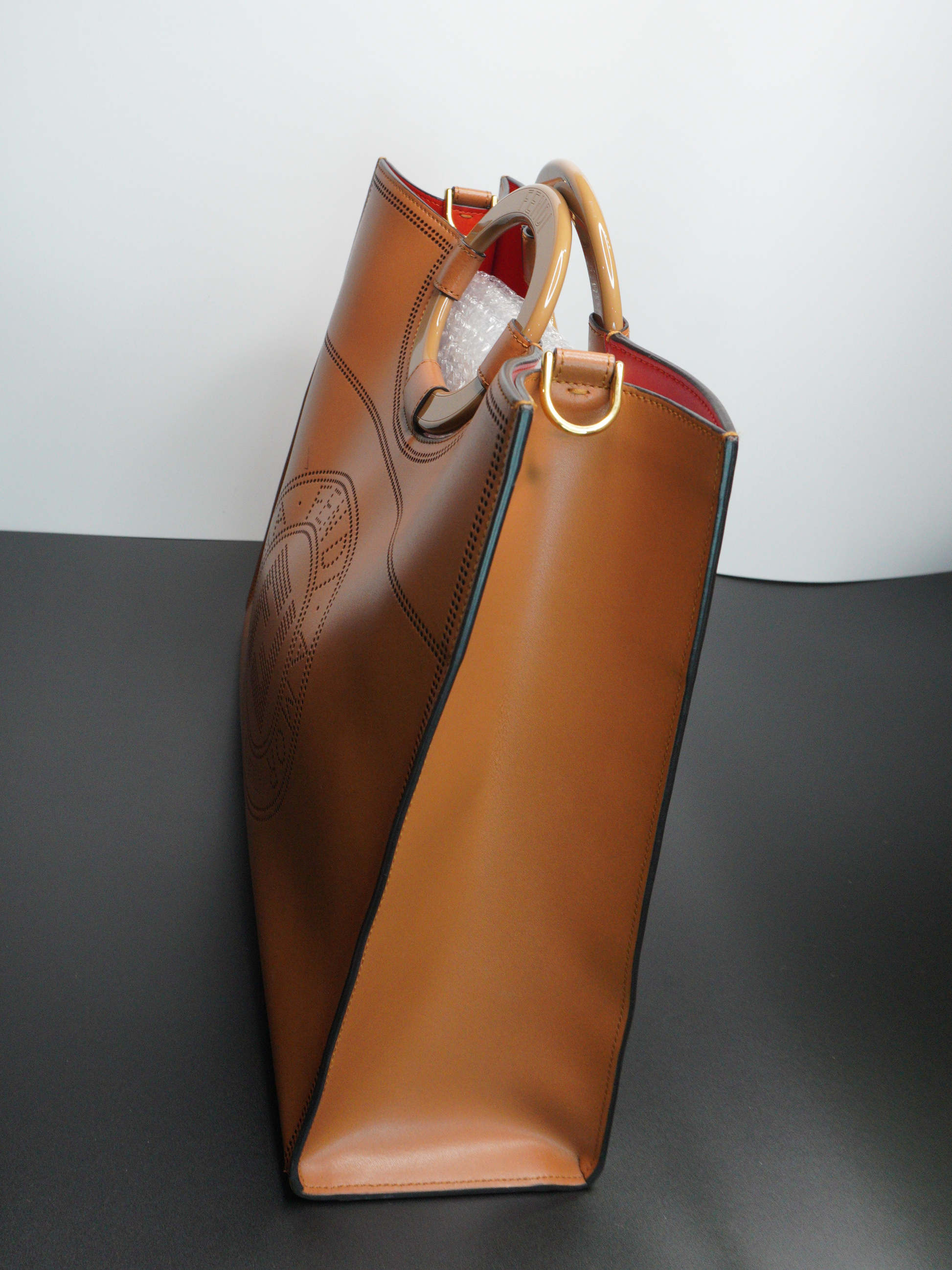 A bold and elegant everyday carry, the Fendi Runway Shopper Tote blends minimalism with signature branding. Featuring smooth tan leather, circular top handles in glossy tortoiseshell-style resin, and the iconic perforated Fendi Roma logo, this structured tote is designed for effortless luxury and maximum space.