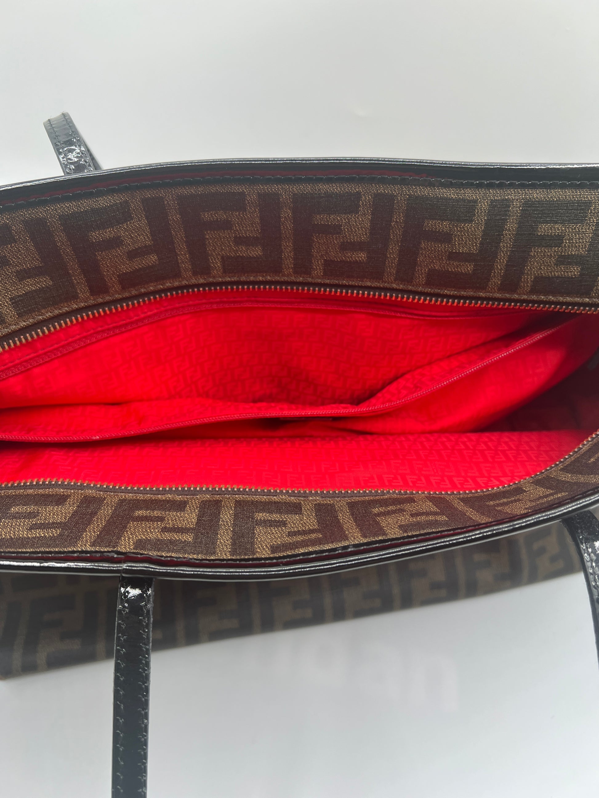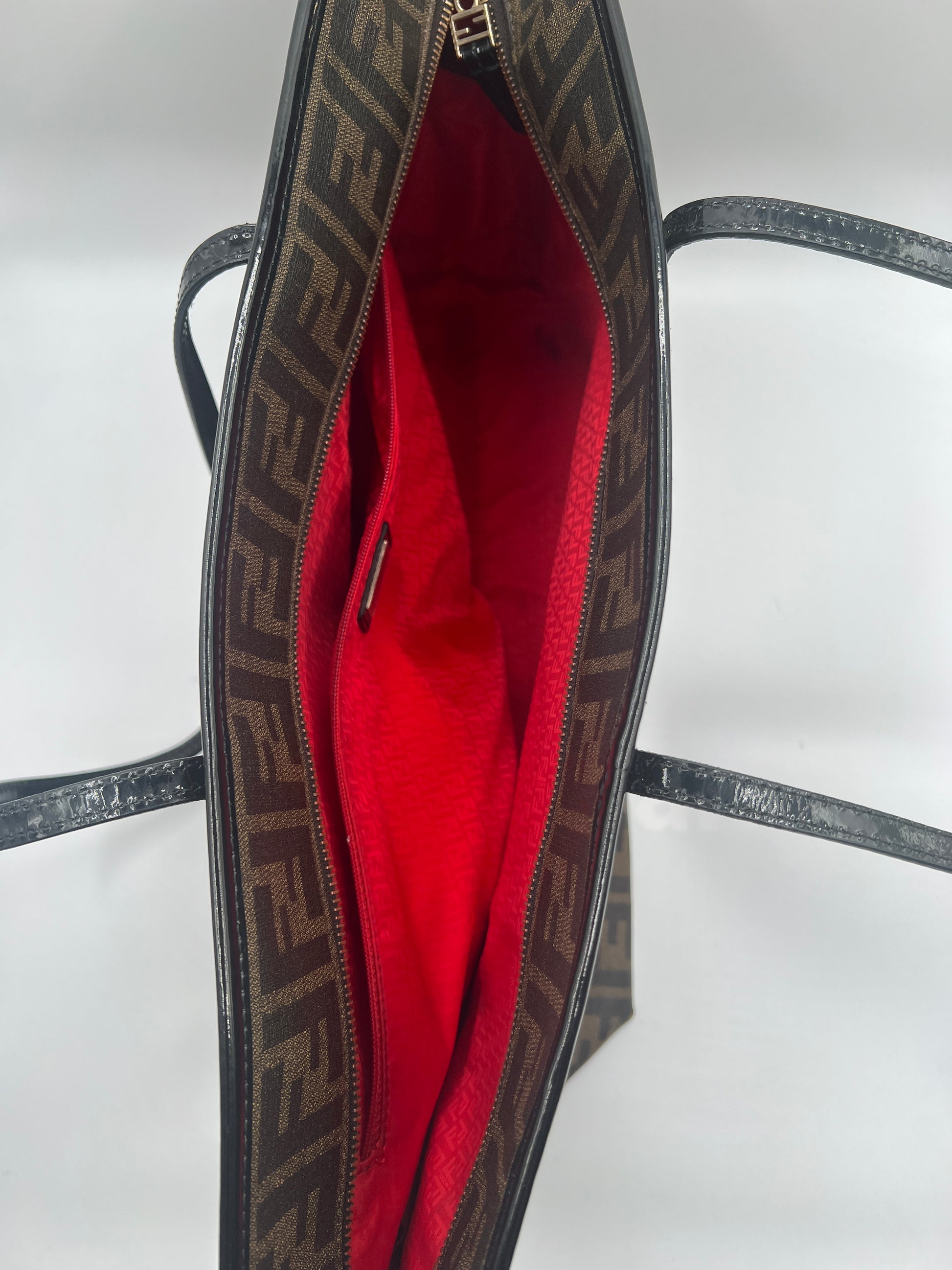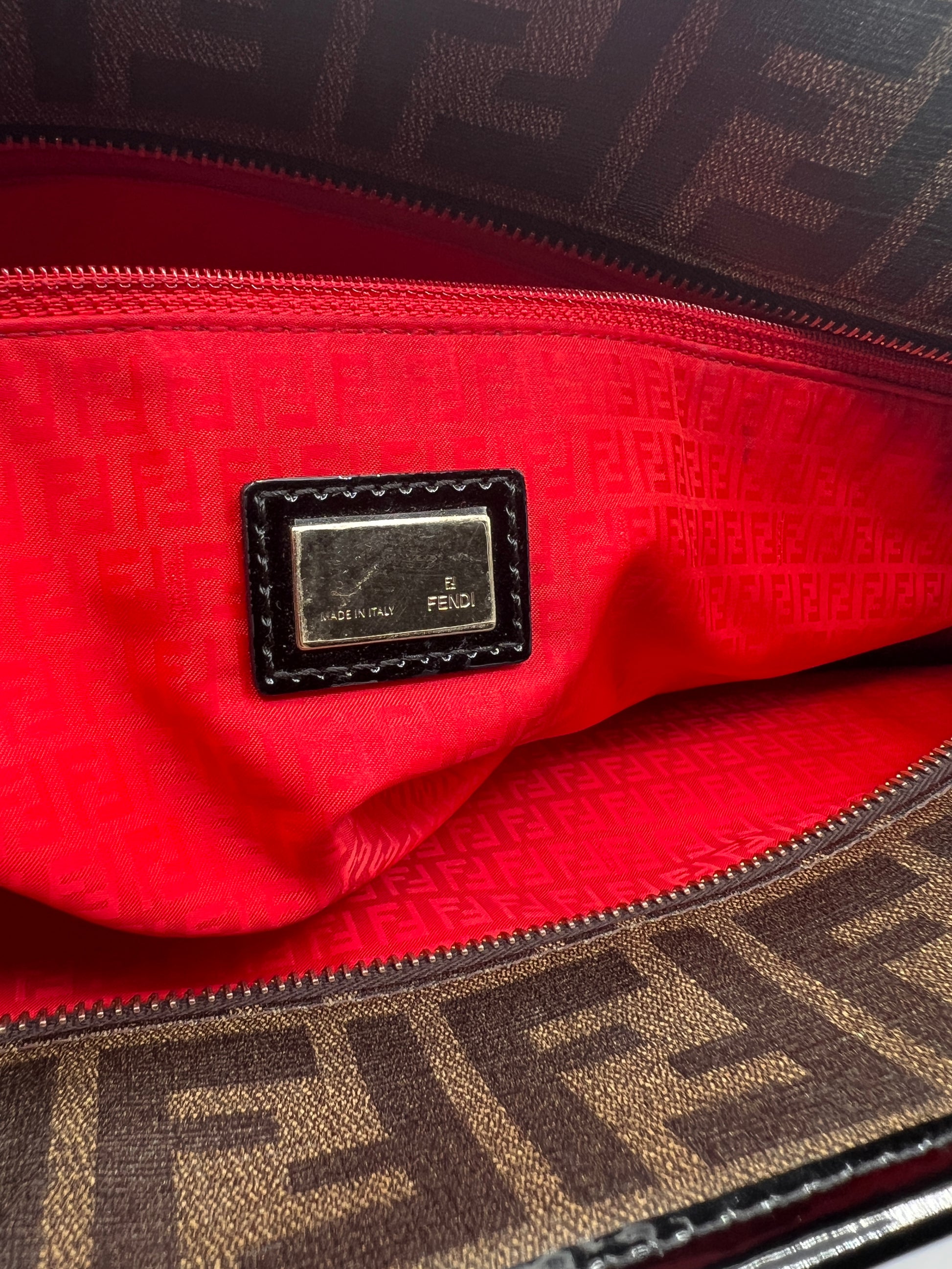 A bold twist on a timeless classic, this Fendi Zucca Spalmati Roll Tote features the iconic FF logo canvas paired with a fierce removable mini Baguette pouch in leopard-print pony hair and red patent leather. A statement piece that seamlessly blends utility with runway flair.
