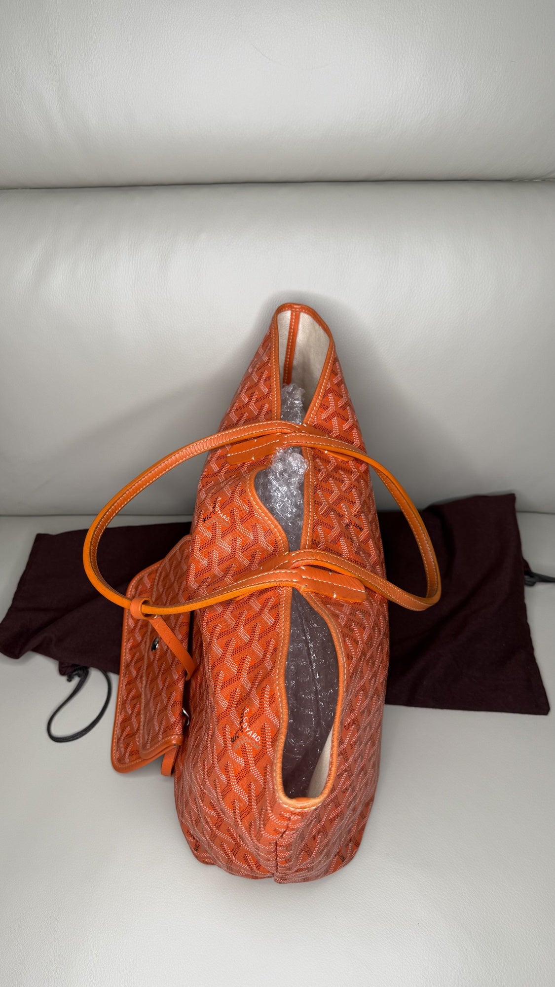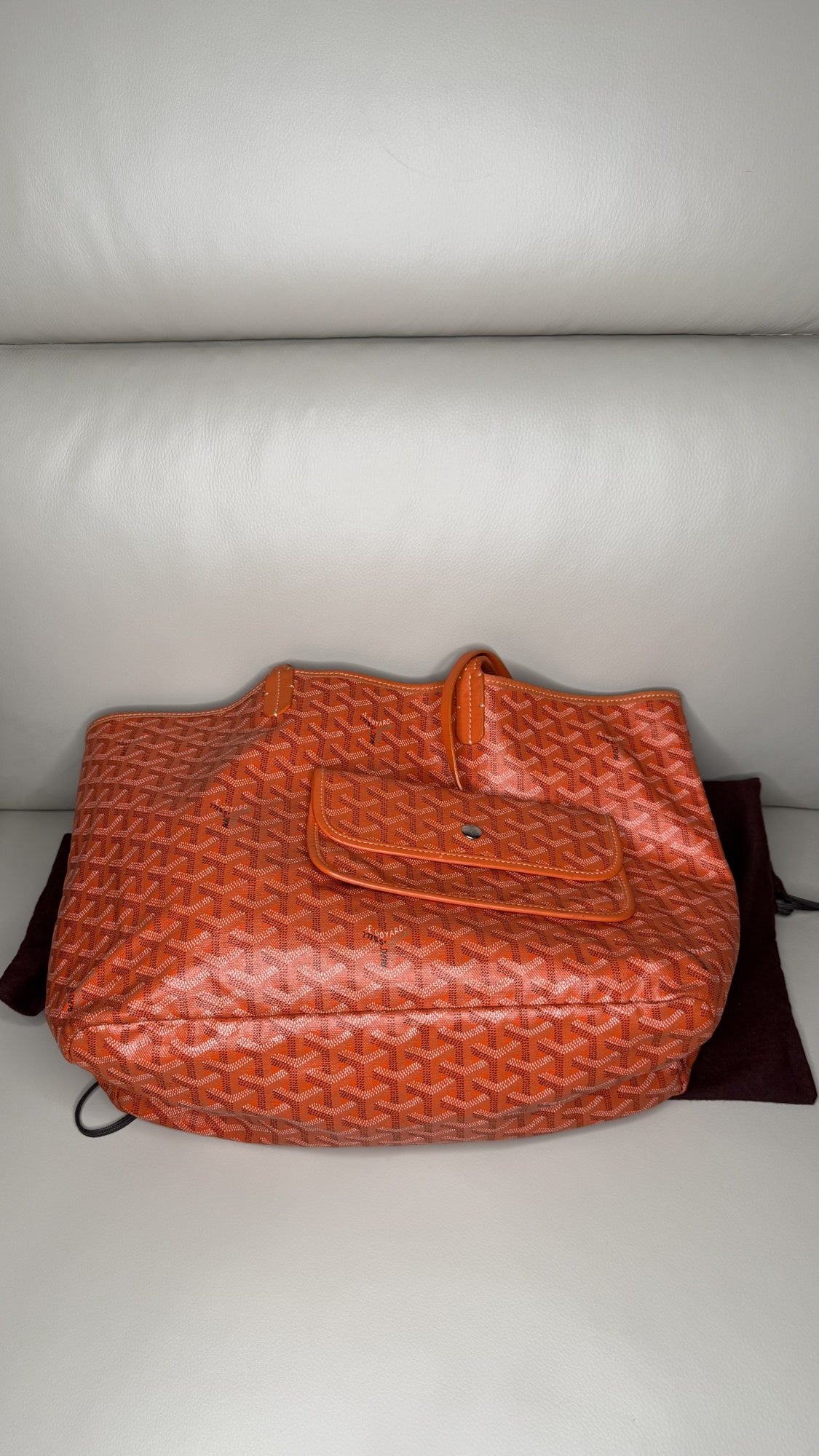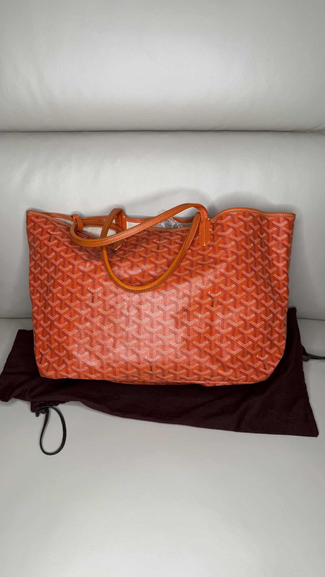 Lightweight yet iconic, the Goyard Saint Louis Tote in vibrant orange is a favorite for its minimalist structure and instantly recognizable Goyardine chevron pattern. Crafted in coated canvas with natural leather trim, it features a spacious unstructured interior and includes a detachable pouch—perfect for daily use, travel, or shopping in effortless style.