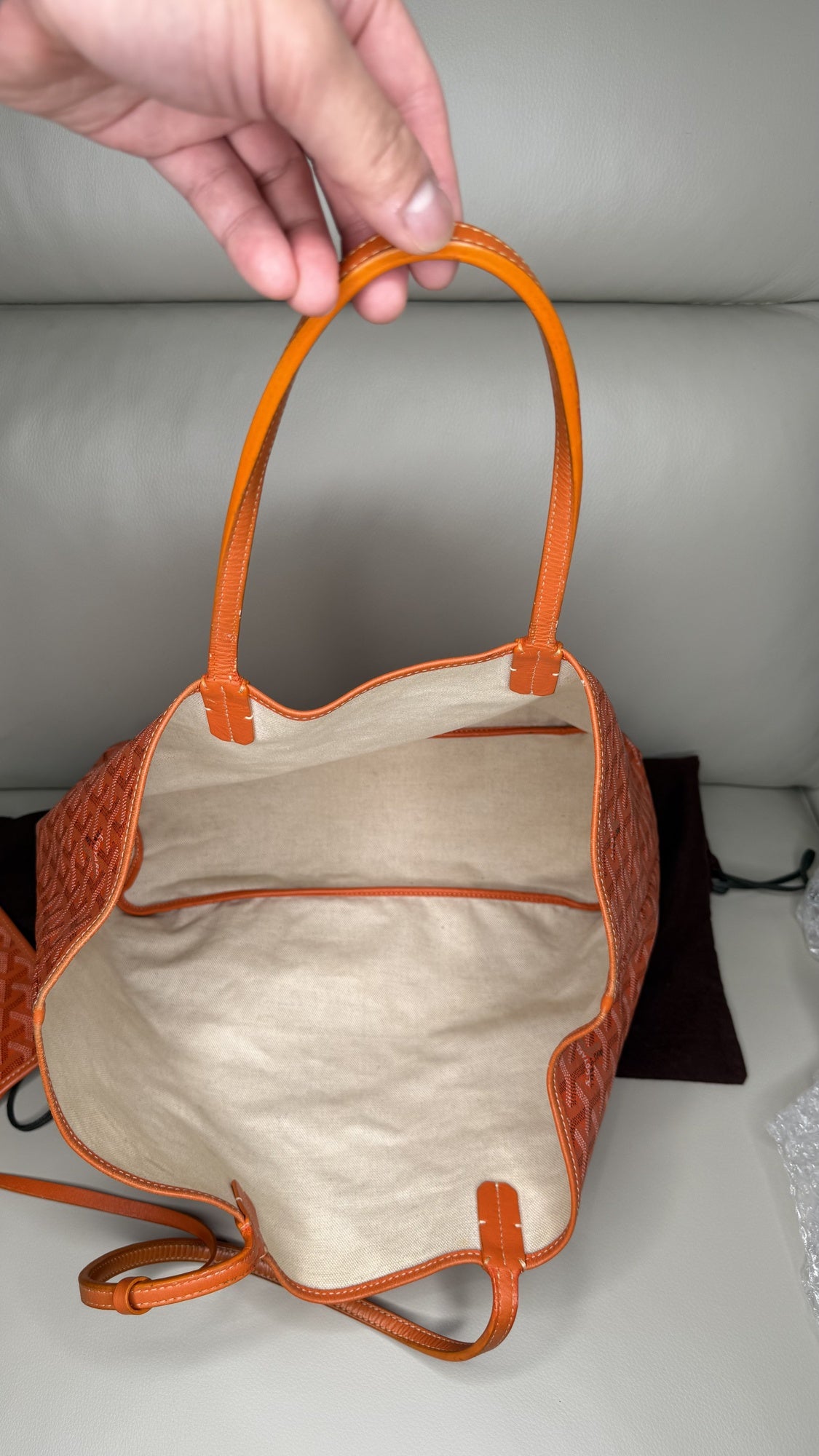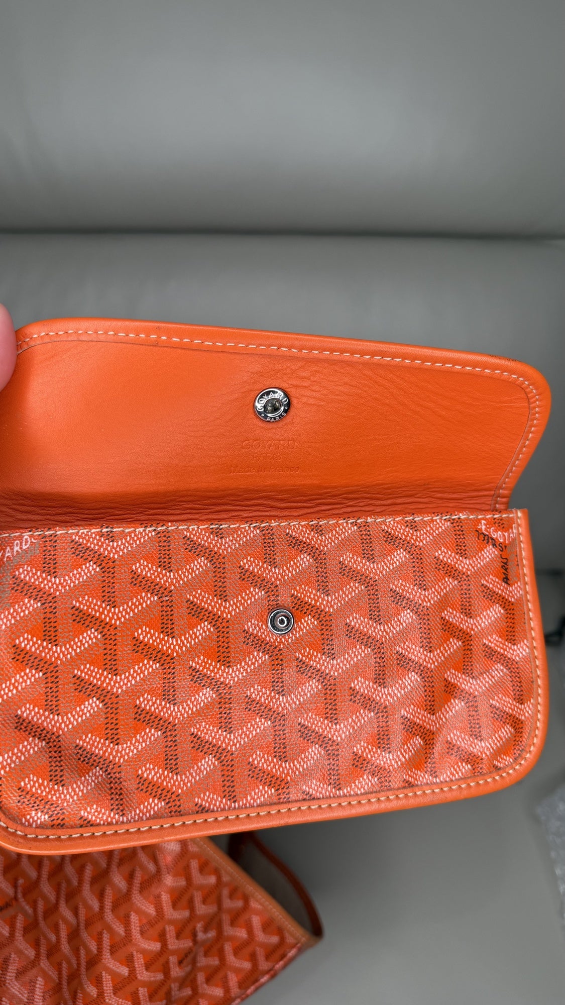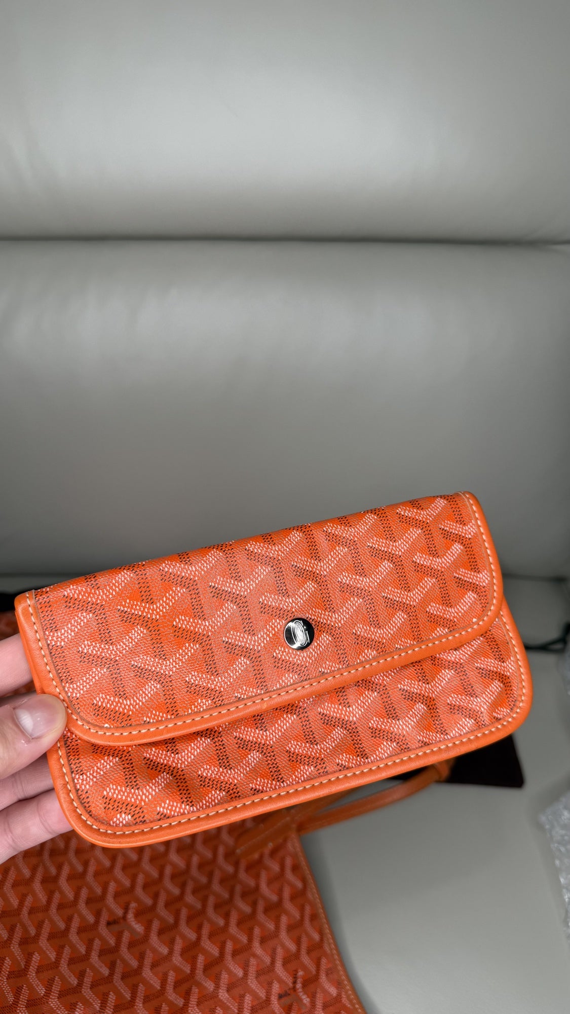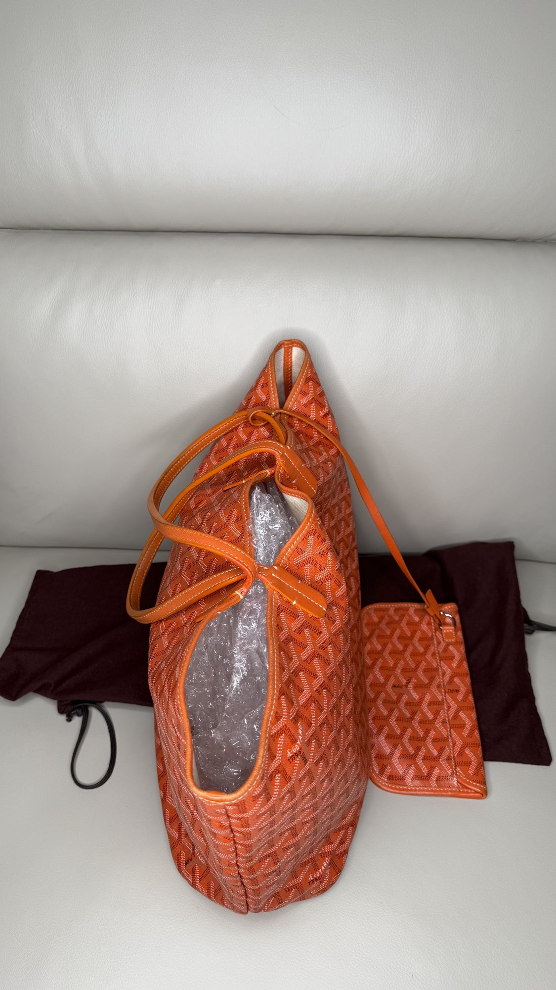 Lightweight yet iconic, the Goyard Saint Louis Tote in vibrant orange is a favorite for its minimalist structure and instantly recognizable Goyardine chevron pattern. Crafted in coated canvas with natural leather trim, it features a spacious unstructured interior and includes a detachable pouch—perfect for daily use, travel, or shopping in effortless style.