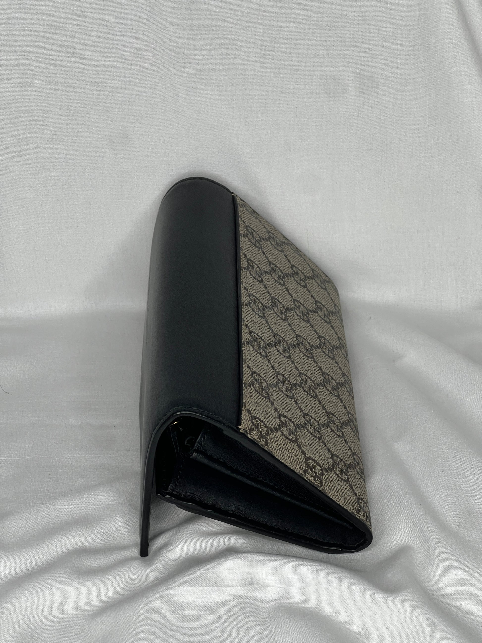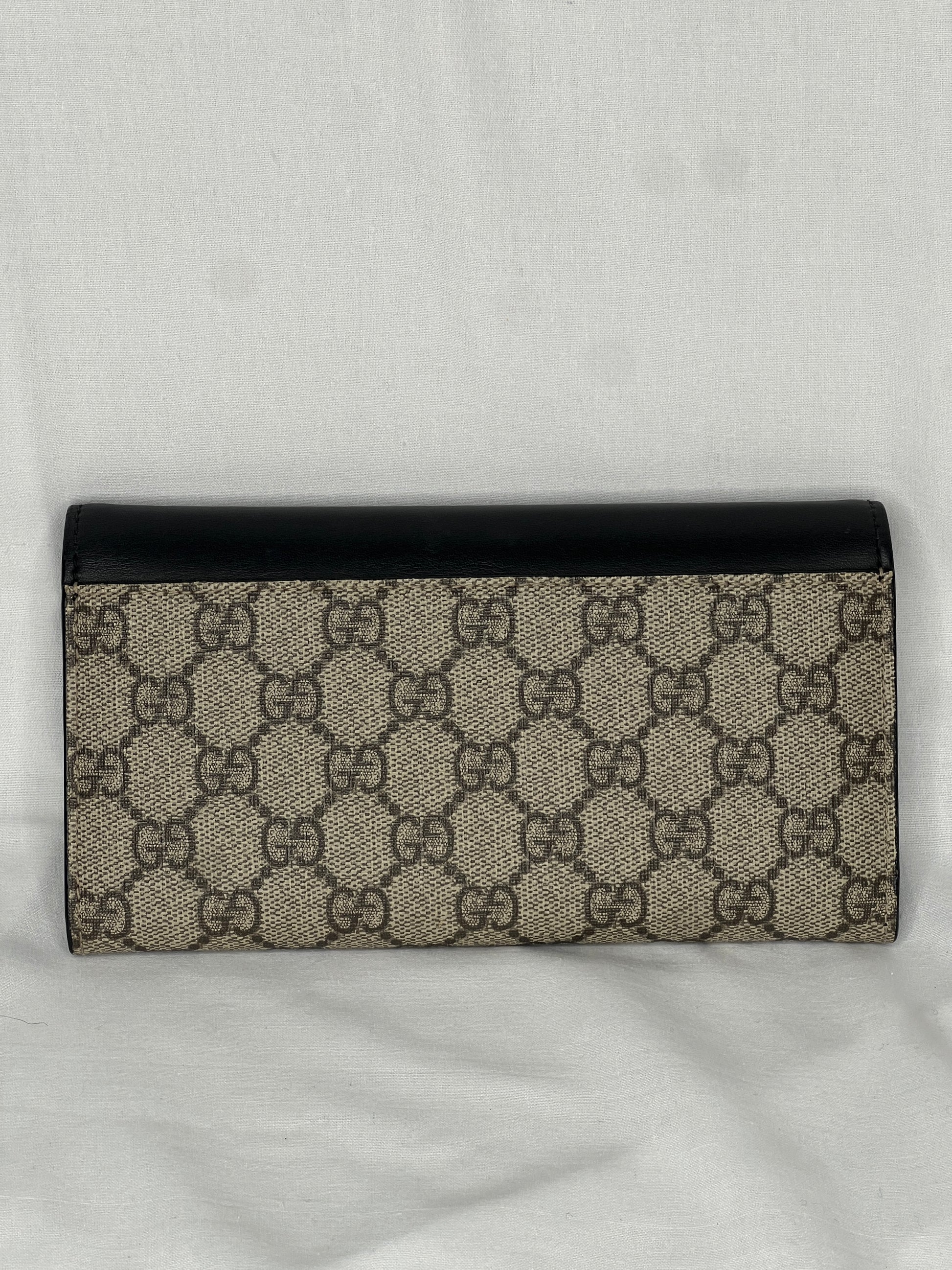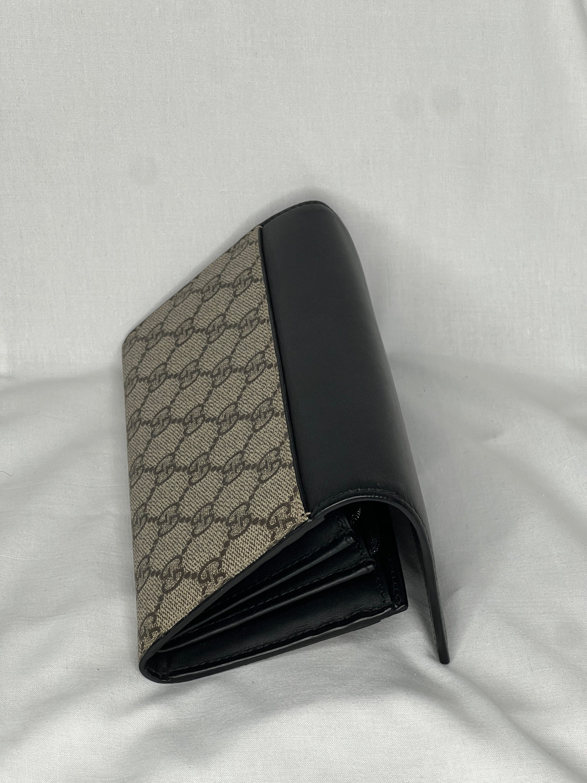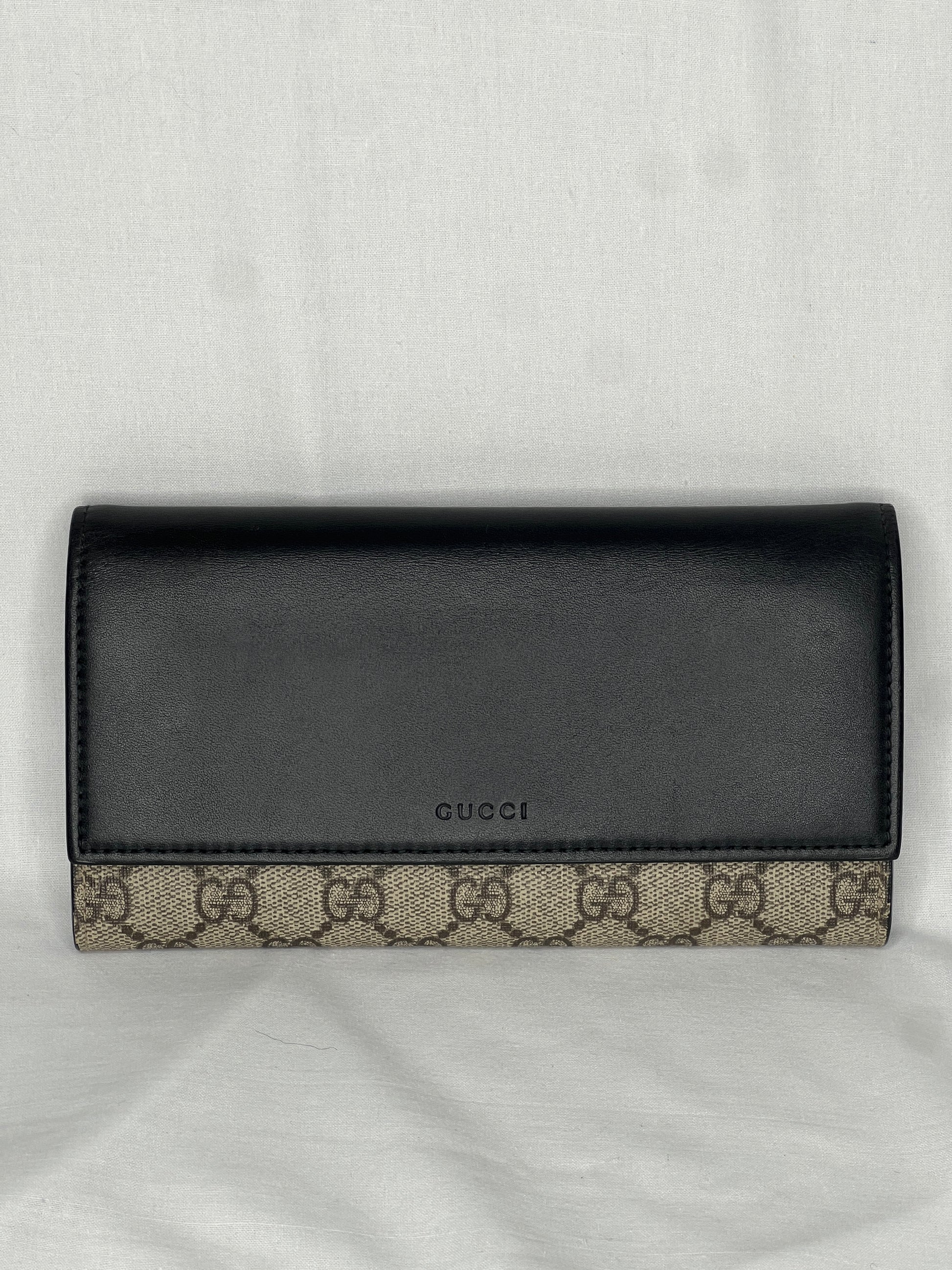 A timeless blend of luxury and function, this Gucci GG Supreme Continental Wallet features the iconic GG monogram canvas paired with smooth black leather. Its sleek, minimal silhouette offers elegant practicality, ideal for organizing cards, cash, and essentials with refined sophistication.