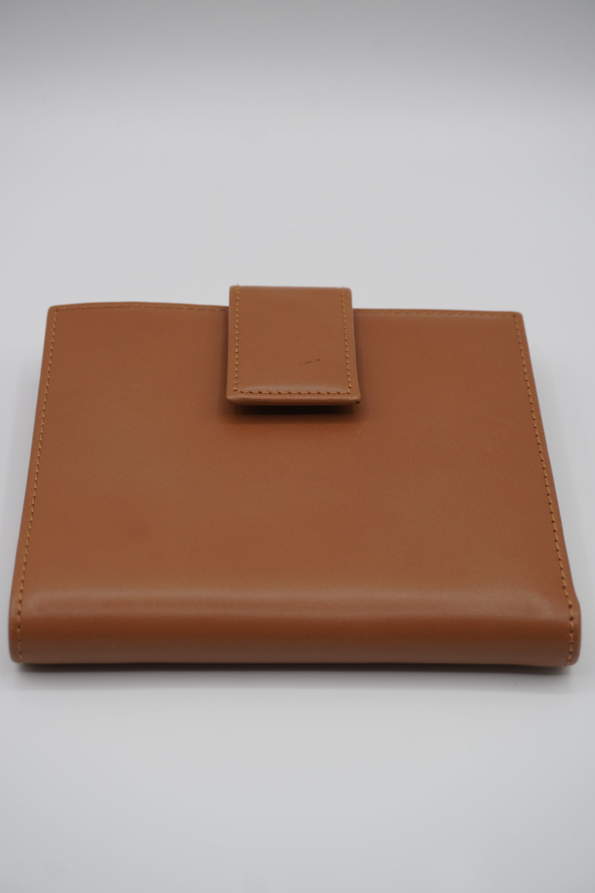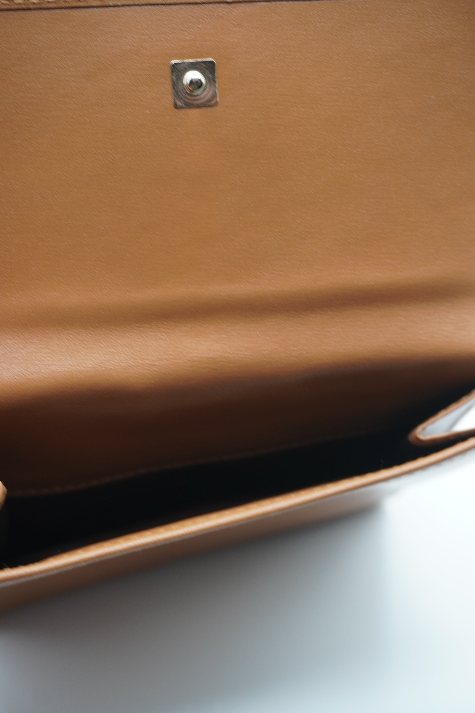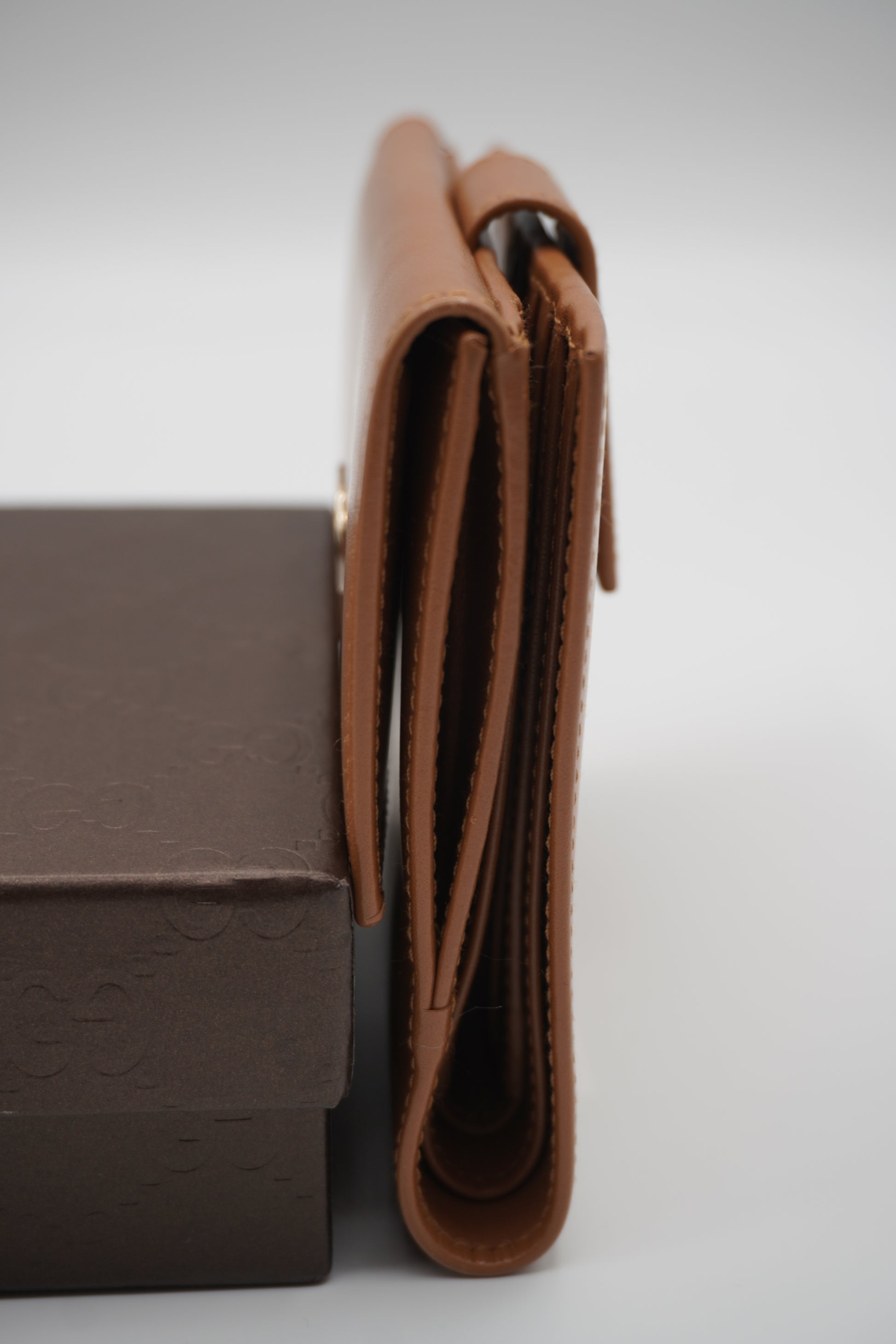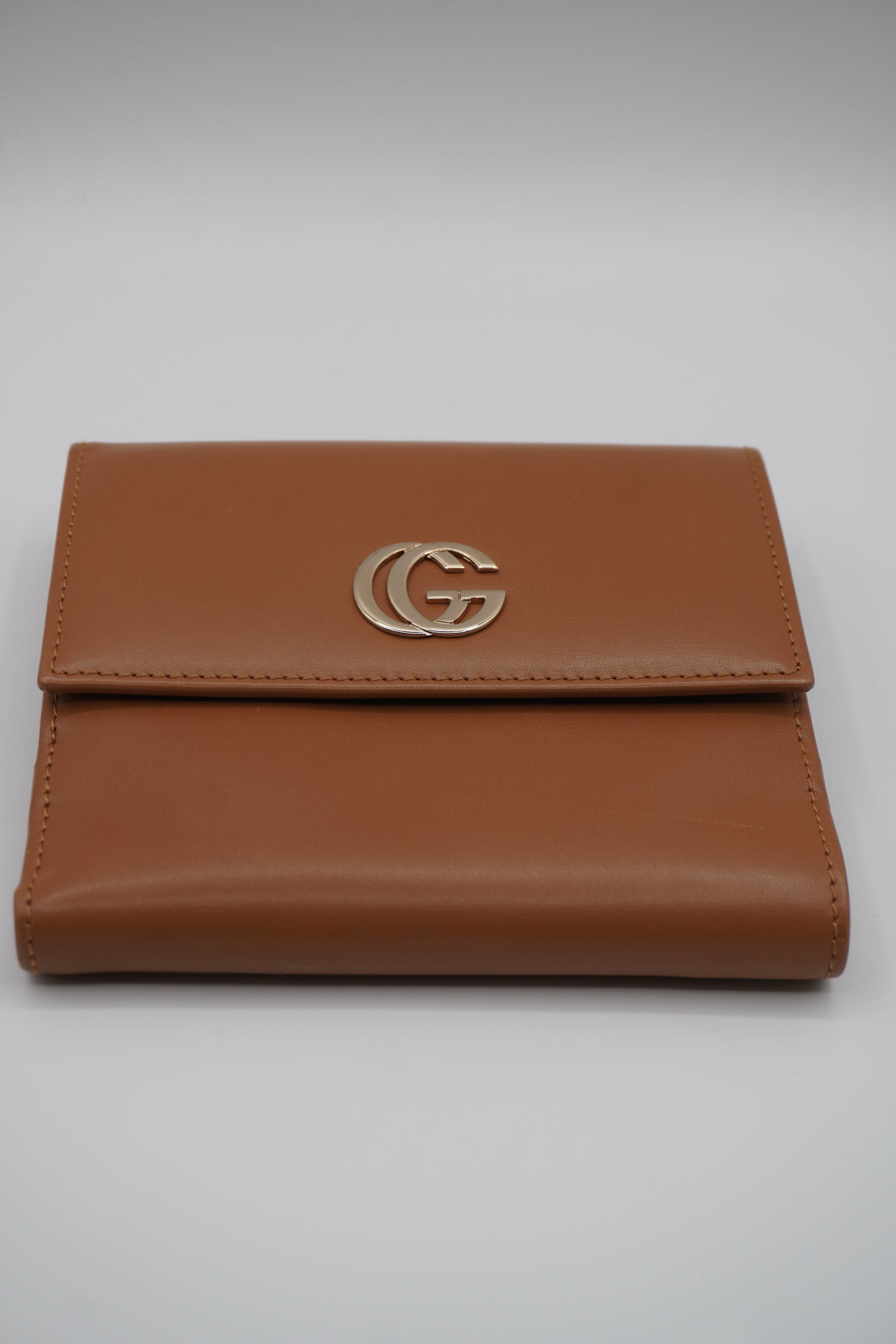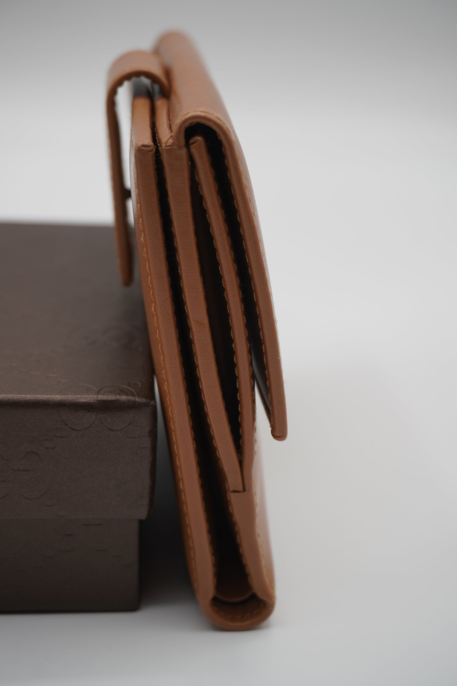 Crafted from smooth tan leather and finished with a bold gold-tone GG logo, this compact Gucci wallet brings effortless sophistication to your daily essentials. Its practical design is perfect for light carry without sacrificing style.
