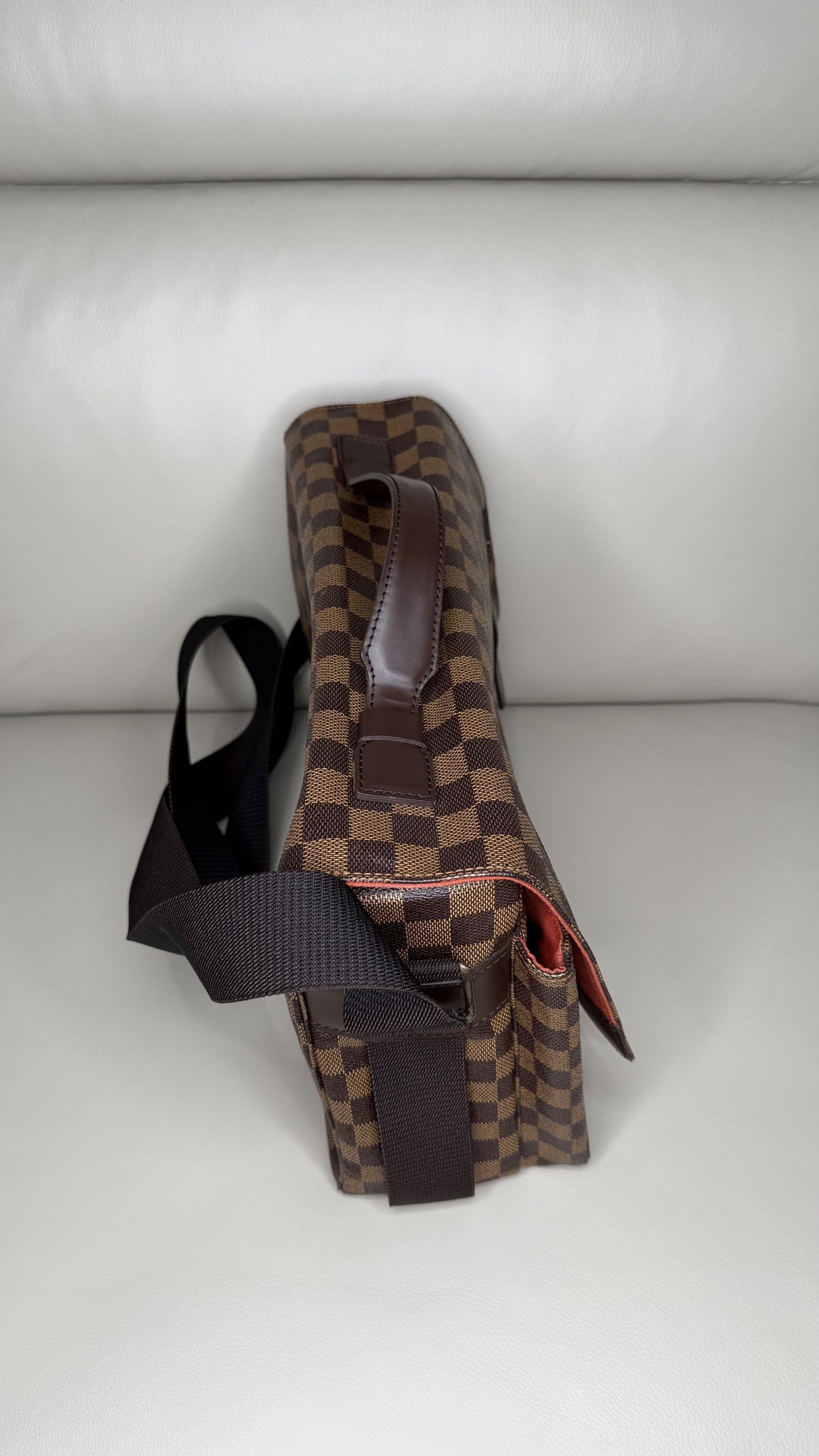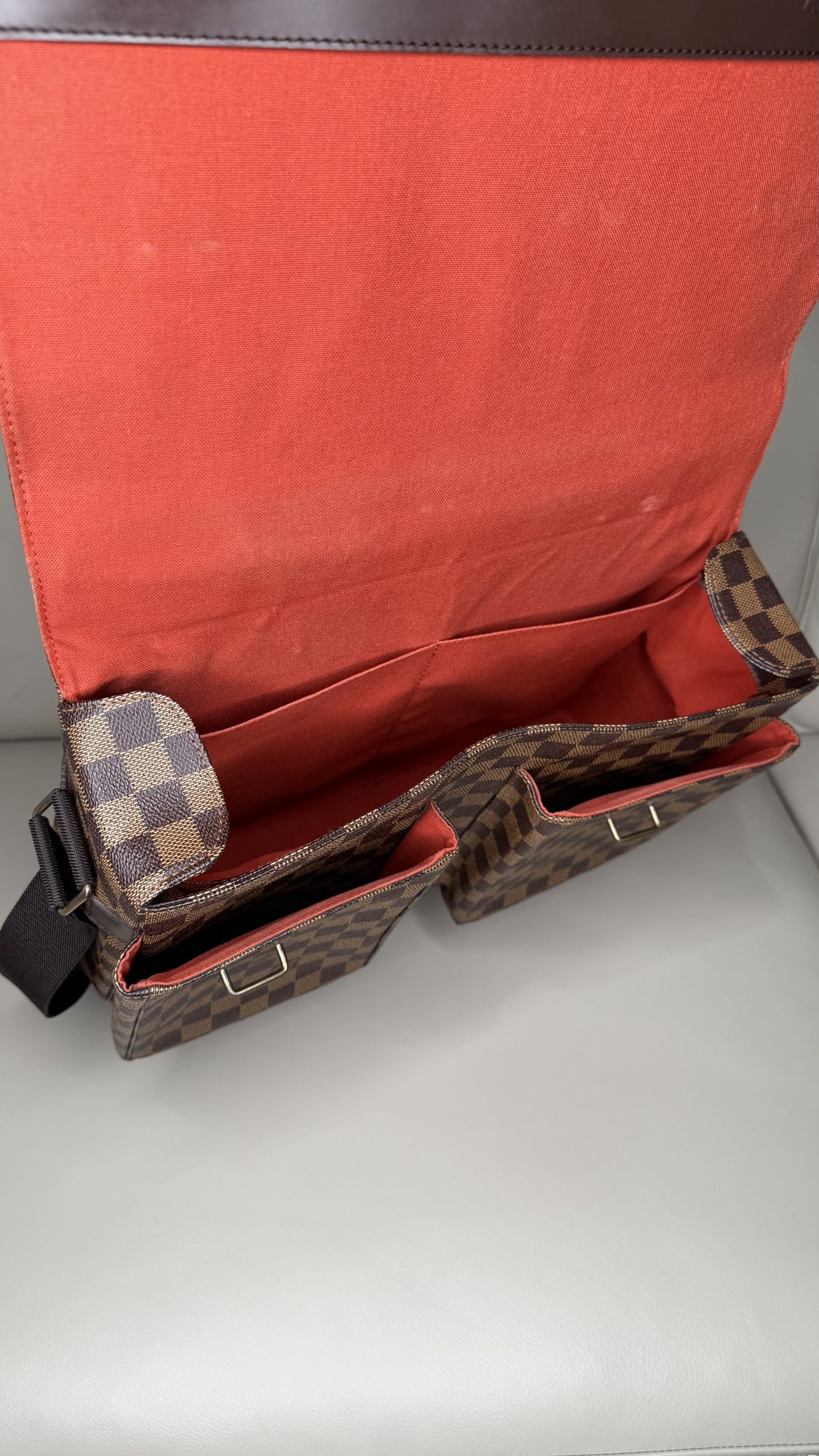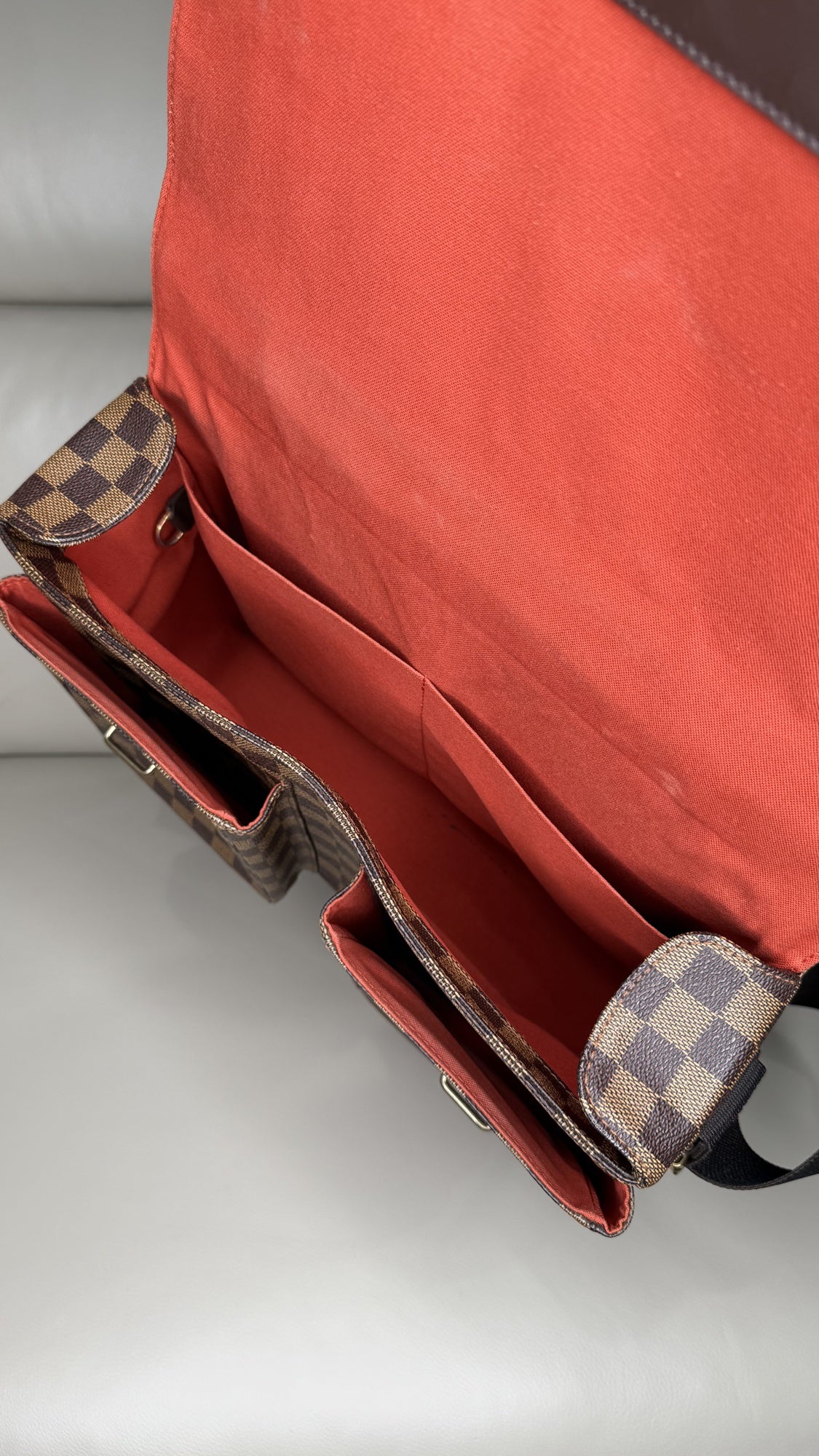 This is the Louis Vuitton Damier Ebene Canvas Messenger bag—casual yet refined, with a pop of color inside.