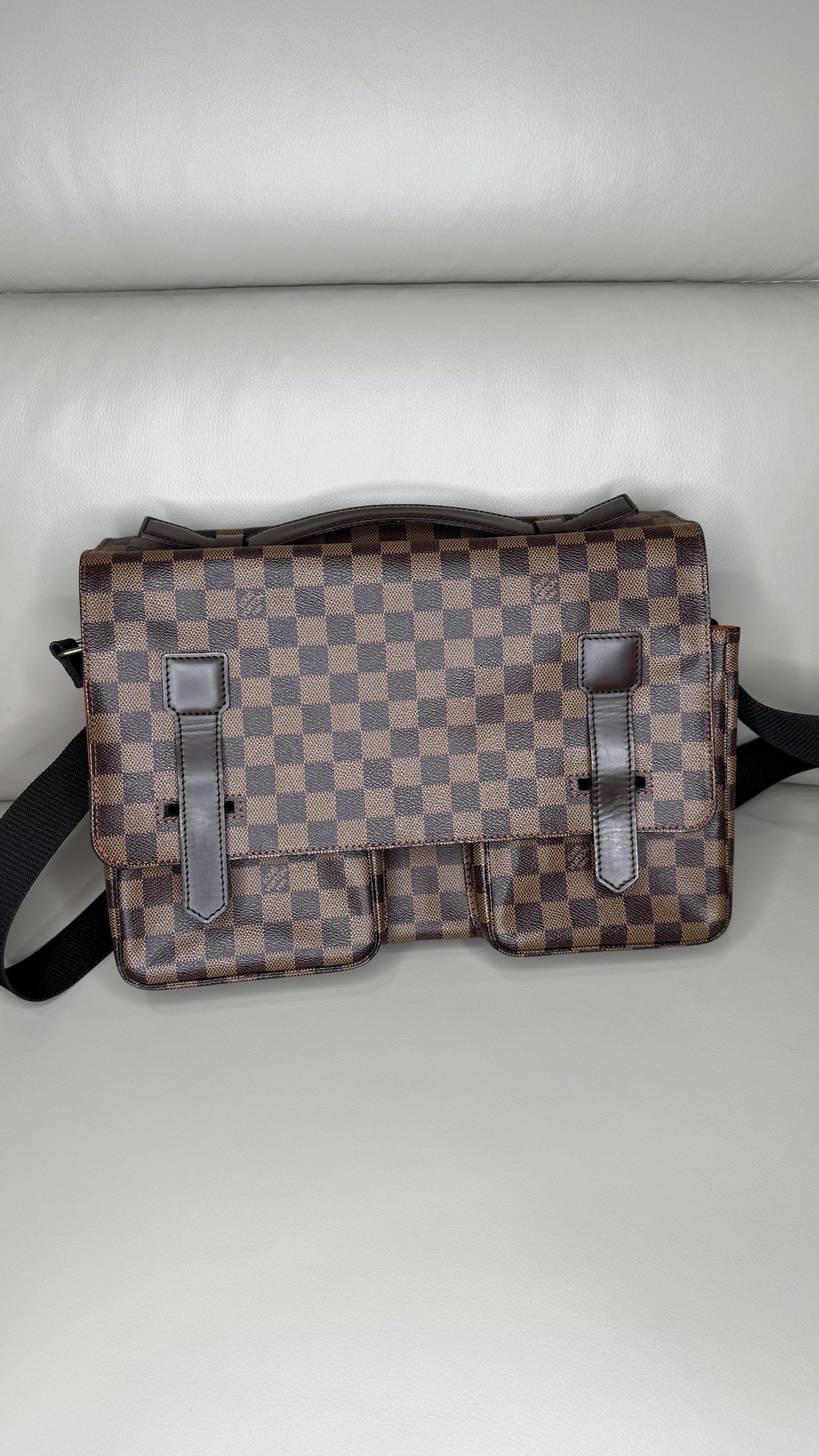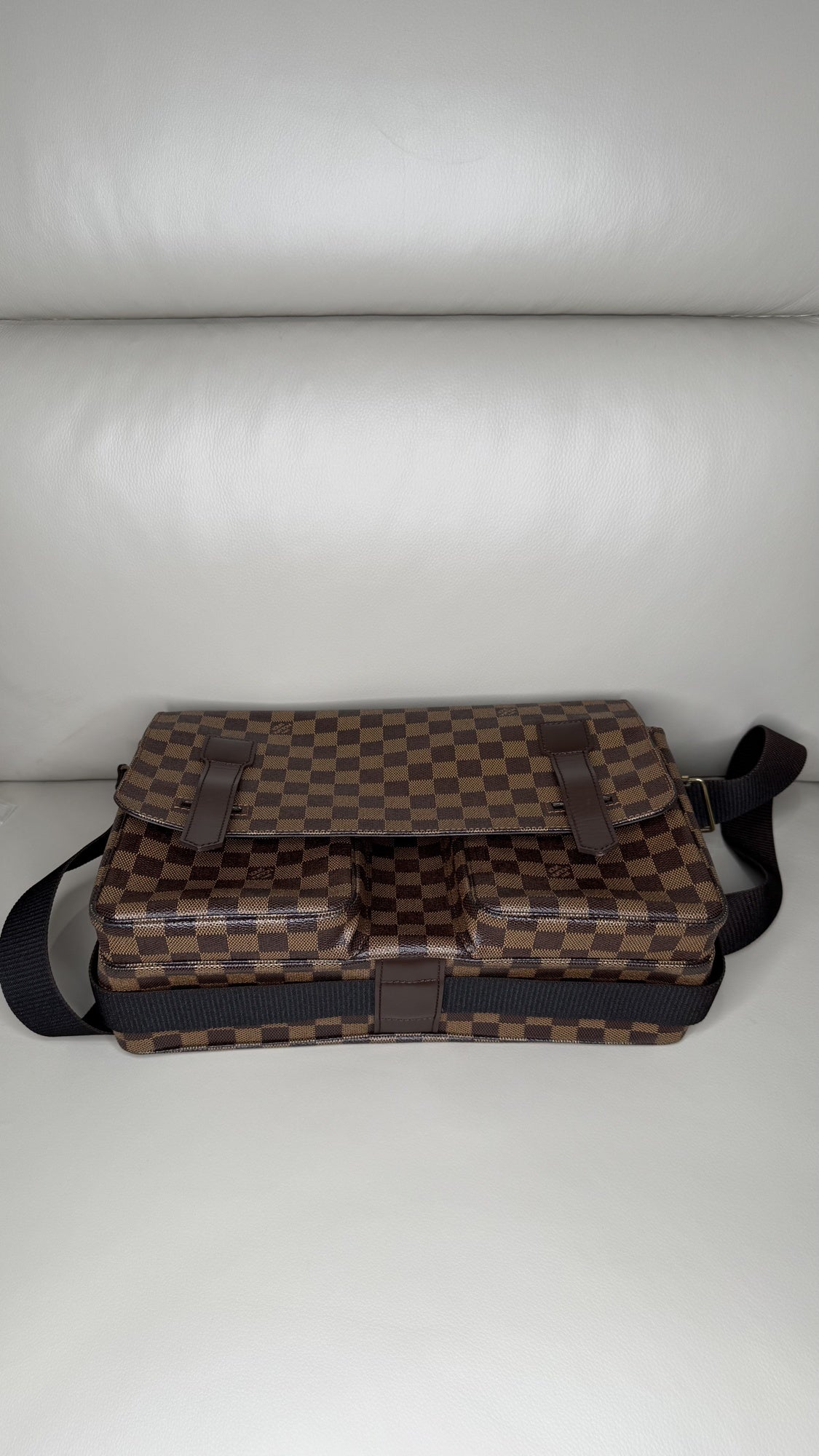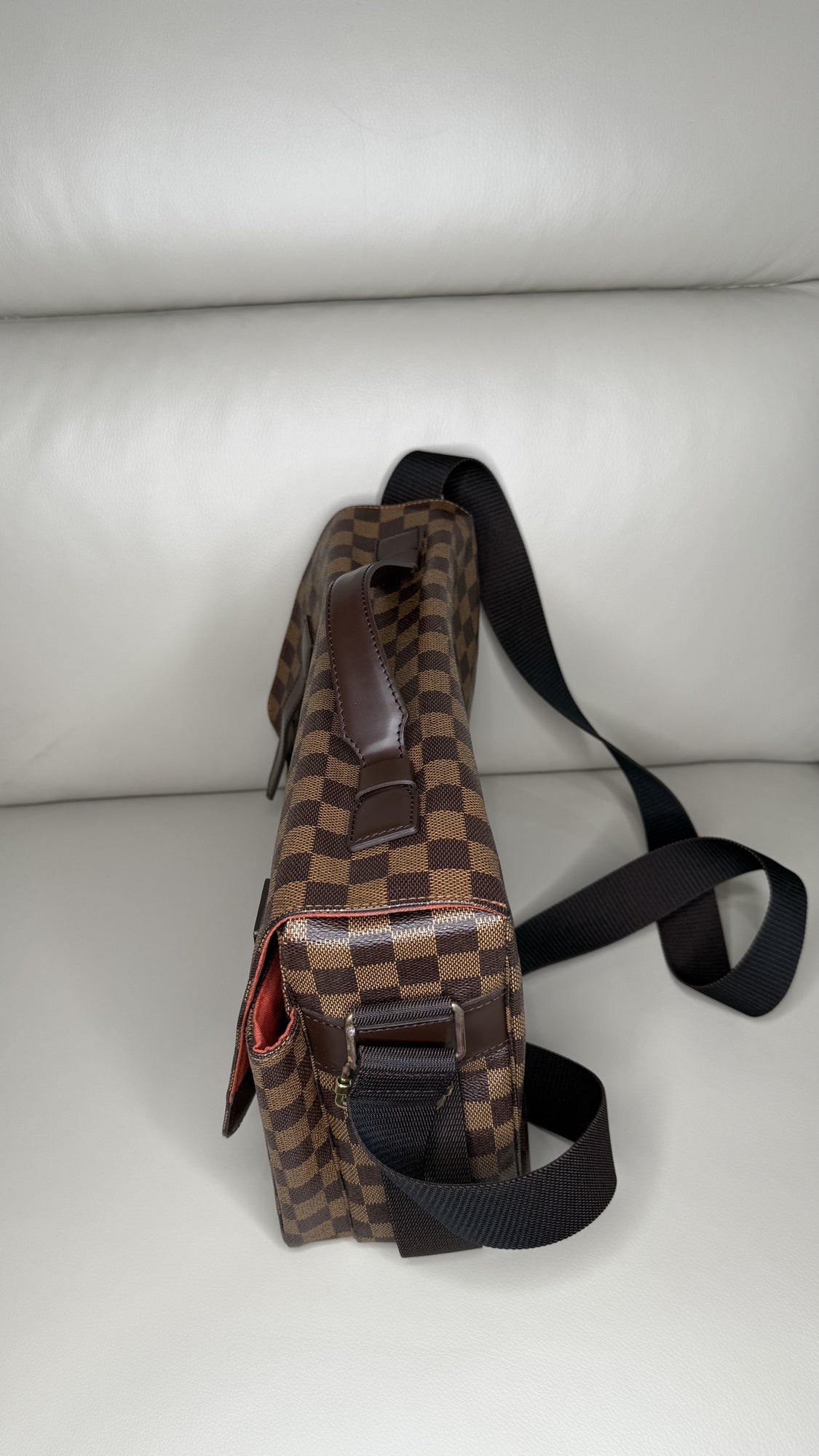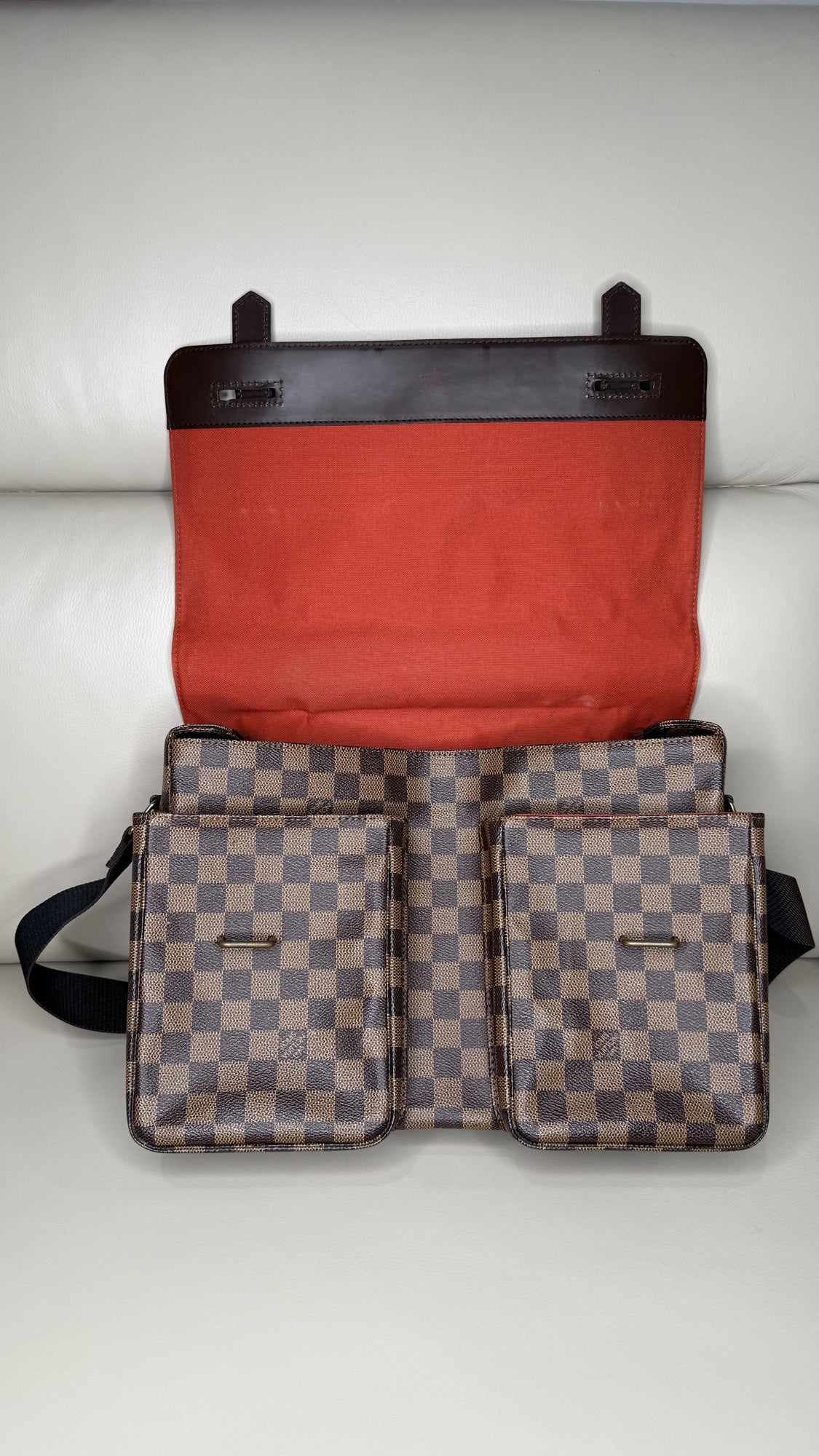 This is the Louis Vuitton Damier Ebene Canvas Messenger bag—casual yet refined, with a pop of color inside.