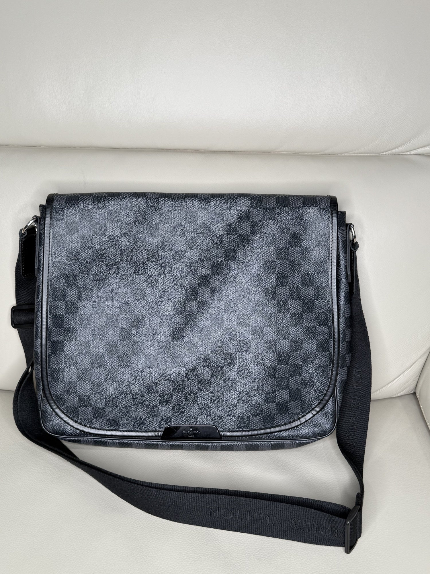 Designed for stylish functionality, the Louis Vuitton District MM Messenger Bag in Damier Graphite canvas is a sleek, everyday essential for modern professionals or urban explorers. The timeless checkered graphite pattern is accented with polished silver-tone hardware and features a secure flap closure over a spacious main compartment. An adjustable Louis Vuitton-branded textile strap ensures comfortable crossbody or shoulder wear, while multiple zippered and slip pockets provide practical organization.
