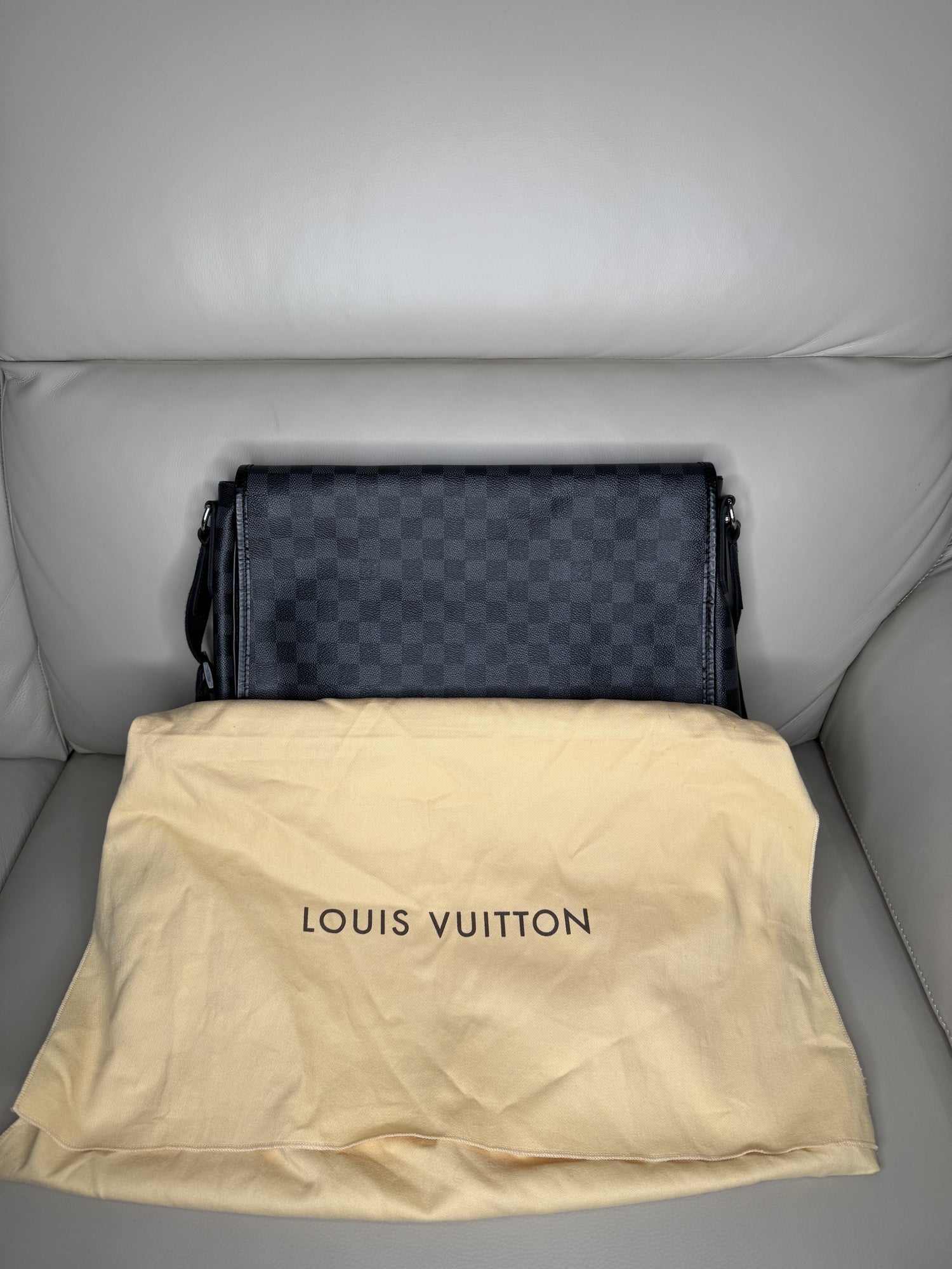 Add a sharp dash of metropolitan style with this Louis Vuitton District PM messenger bag in Damier Graphite canvas, set off by smooth black leather trim and polished silver-tone hardware. The fold-over flap, rear zip pocket and adjustable jacquard strap make it equally at home on the daily commute or weekend getaway.