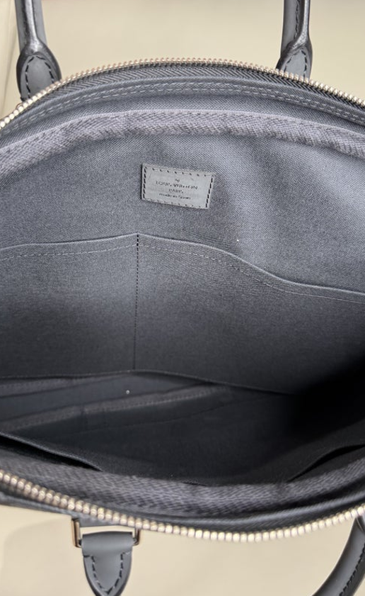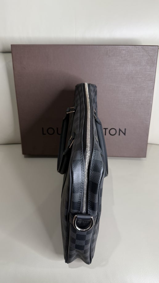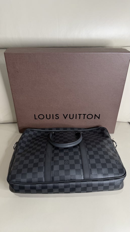 This is the Louis Vuitton Porte-Documents Voyage in Damier Graphite coated canvas—an elegant, professional briefcase that’s equally at home in the boardroom or on the go.