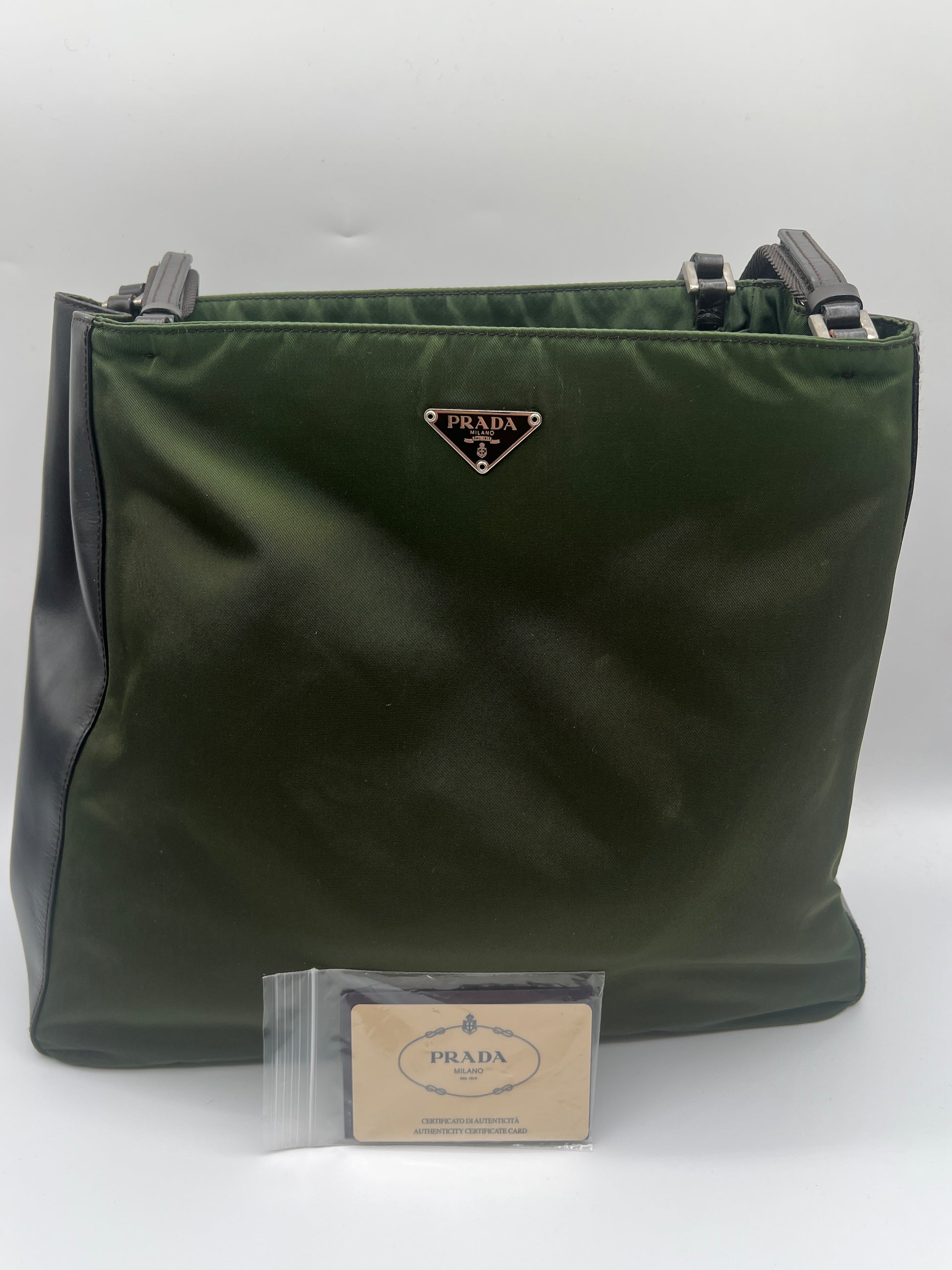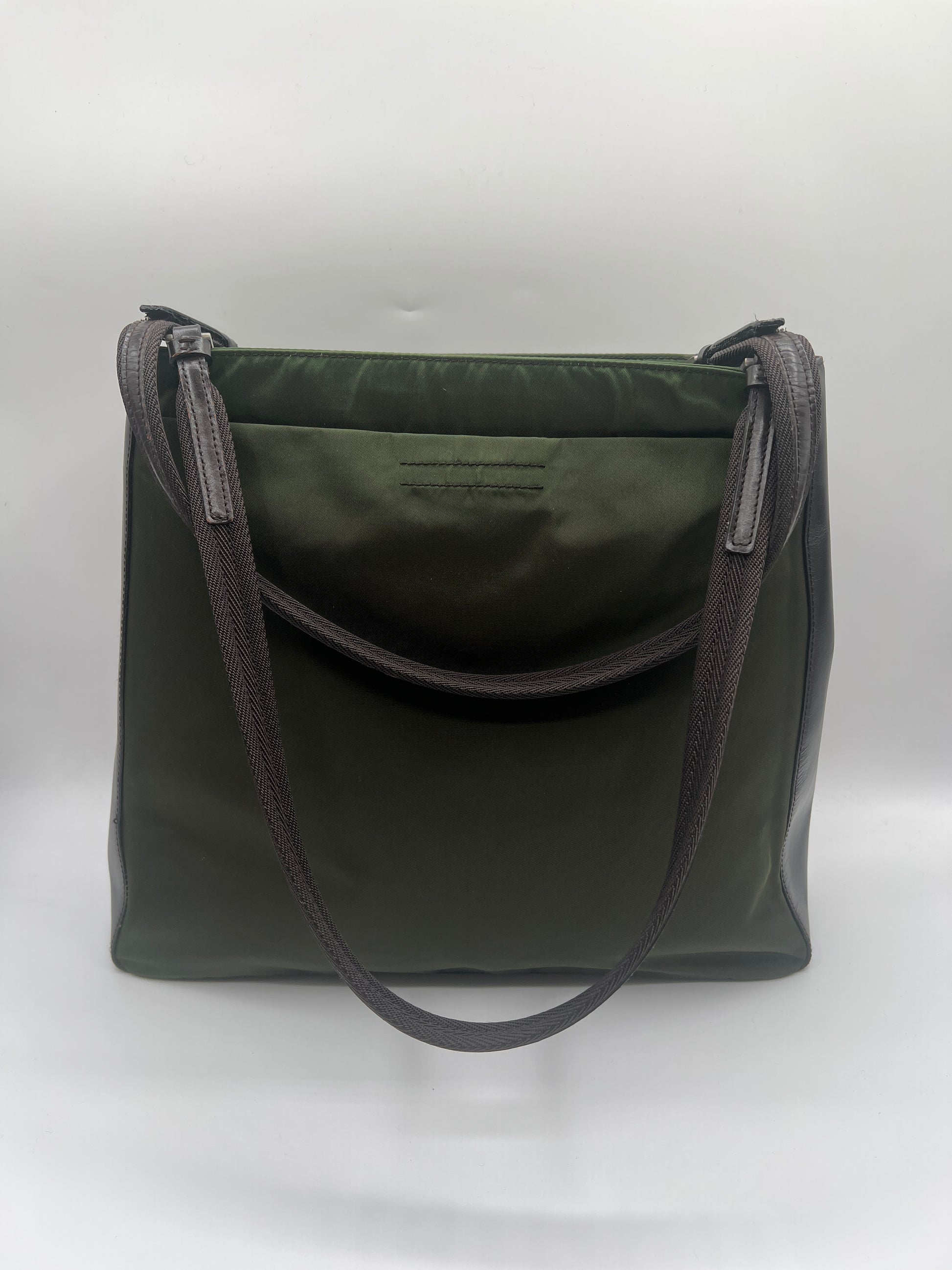 Prada Olive Green Nylon Tote Bag with Brown Leather Trim