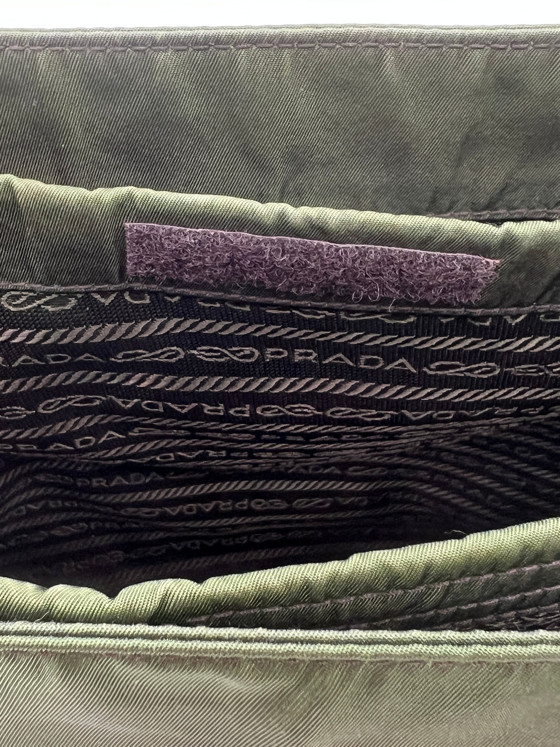 - Interior: Spacious compartment with Prada logo lining and zip pocket