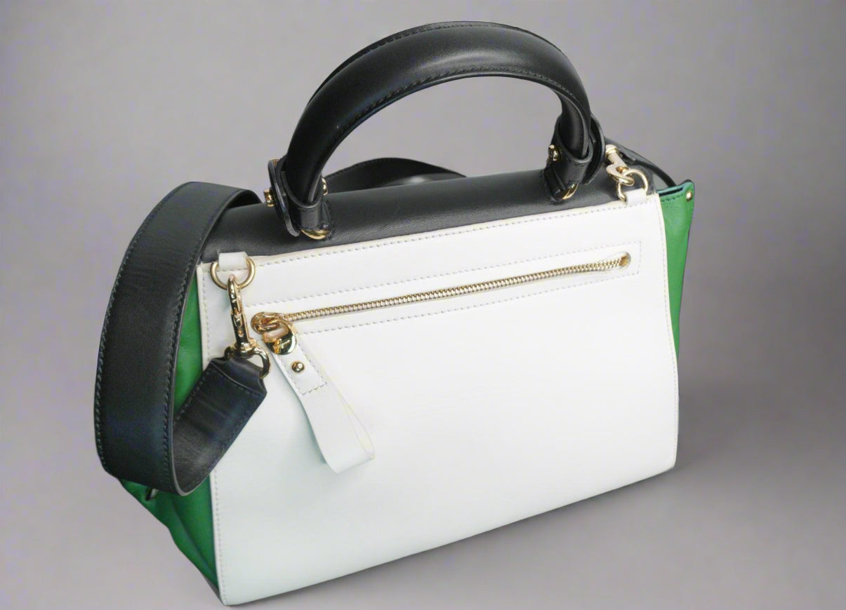 This Salvatore Ferragamo Sofia Small Satchel is a sophisticated, structured handbag that combines luxury with practicality. Crafted in a bold color-block design featuring black, white, and green leather, it offers a refined yet eye-catching look. The front flap is secured with Ferragamo’s iconic Gancini gold-tone clasp, while the interior is roomy enough for your essentials. The top handle and removable shoulder strap provide versatile carry options.